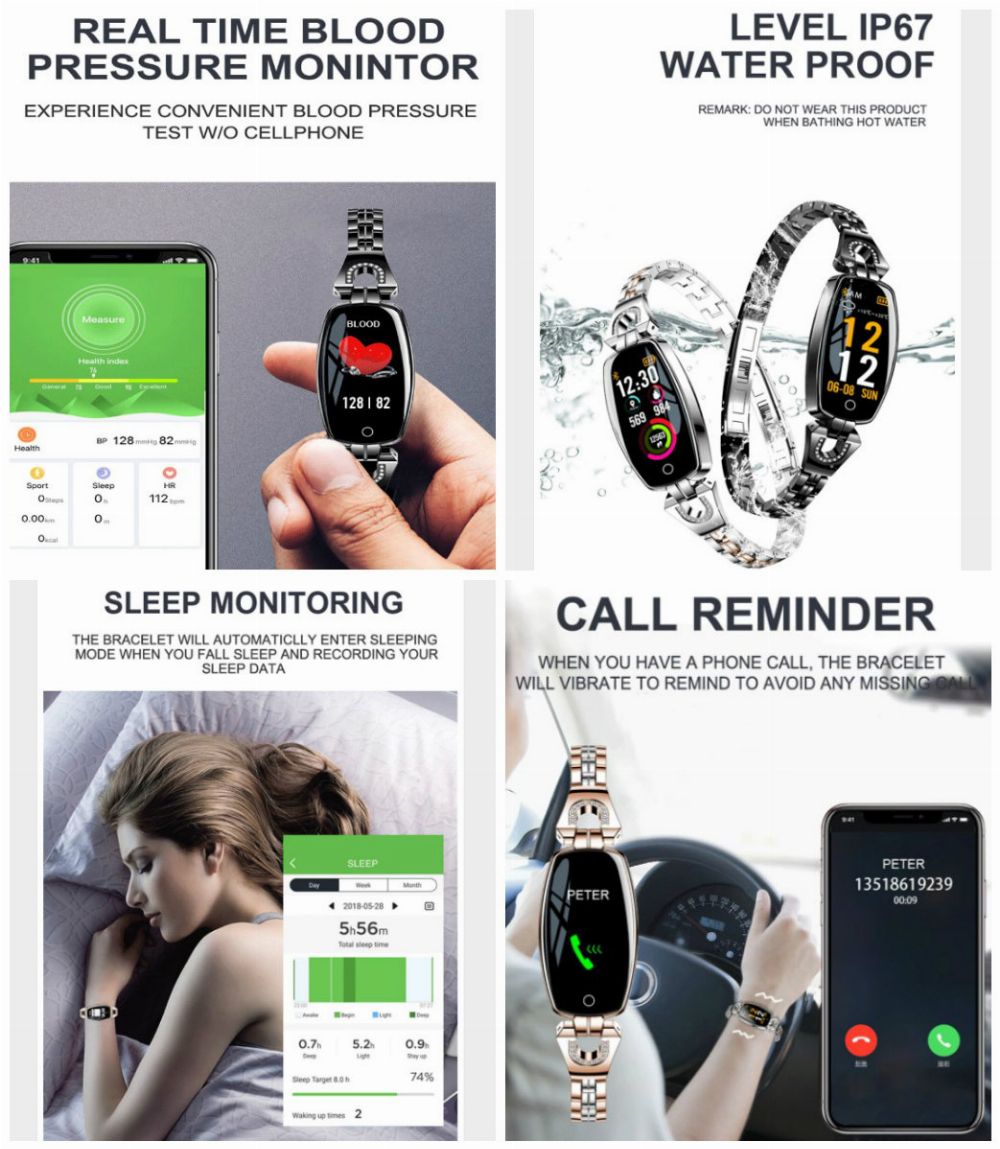 Main Function: ● 24 hours continue Heart rate detection, Blood pressure test. ● Time / clock display, step, calories, distance, switch on/off display. ● Multiple sport mode (running, swimming, riding, climing, basketball, football,walking, batminton). ● Sleep monitoring (sleep time, sleep quality, stay up late). ● Call reminders, SMS reminder, qq reminder, micro reminder, Skype, facebook, whatsApp reminder. ● Find the phone and find the bracelet, WeChat sports, turn the wrist bright screen, stopwatch. ● Alarm clock / medication / meeting / sedentary / drink reminder. ● Remote control camera (shake shake to take pictures). ● Friends and relatives of the movement, measurement data mutual investigation. Parameters: Compatible System: Android system 4.4 version or above; iOS system 8.0 version or above Bluetooth Version: Bluetooth 4.0 Waterproof Rating: IP67 Screen Size: With 0.96 inch TFT screen Chip:NRF52832 PPG Chip: HRS 3300 Battery: 120mAh Motor: Built in, vibratng reminder Waterproof Level: IP67 Please note that due to geographical differences, the weather will not be displayed on the watch abroad. ​ Question: 1. Question: What is its APP name? Answer: Its APP name is WearHeart, APP connects to mobile phone Bluetooth, you can implement call reminder, SMS reminder and social reminder, such as QQ reminder, WeChat reminder, Skype, facebook, whatsApp reminder, etc. 2. Question: Does it support swimming? Answer: Its waterproof rating is IP67 waterproof, can only be worn for daily washing, can not wear a bath or swim, can not touch in the hot water. 3. Question: What is the system it supports? Answer: It supports Android system 4.4 or above, iOS system 8.0 or above, support bluetooth 4.0.