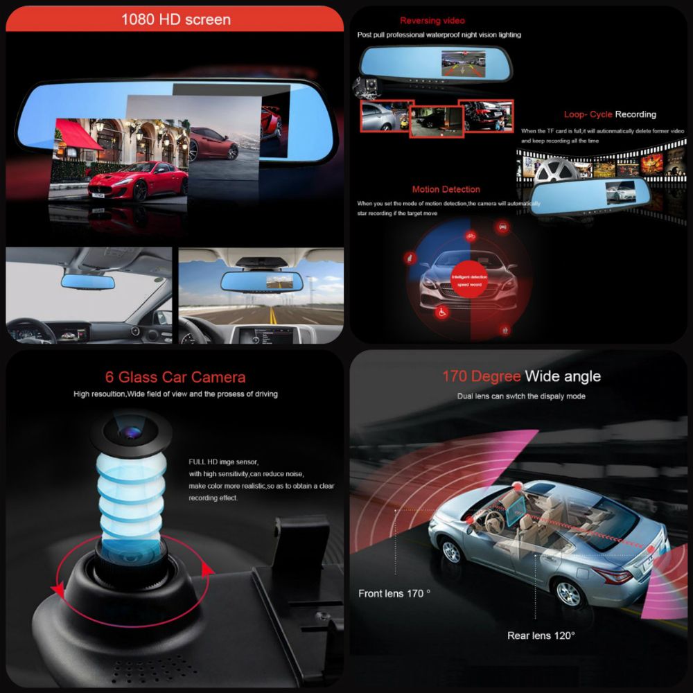 Screen:4.3 inch HD LCD Screen Support For Memory Cards:Support Max TF card 32GB (Suggest use C10 speed TF Card) Lens Material:6G-Glass Len Aperture:F2.0 Video and photos Video resolution: 1920 * 1080P ,1280 * 720P Video format: AVI Picture format: JPEG Angle Front Len angle: 170 degrees Rear Len angle: 120 degrees Main Function Rear view Double lens Loop recording Motion detection Microphone:Built-in Noise Cancellation of Microphone:Built-in Power Supply:12 / 24V input,5V / 1A output Packing specifications ​Single Len DVR Package Contents: 1* Package Box 1* Car dvr 1* Car charger 1* User manual Dual Lens DVR Package Contents: 1* Package Box 1* Car dvr 1* Rear lens with 5.5 meters cable 1* Car charger 1* User manual