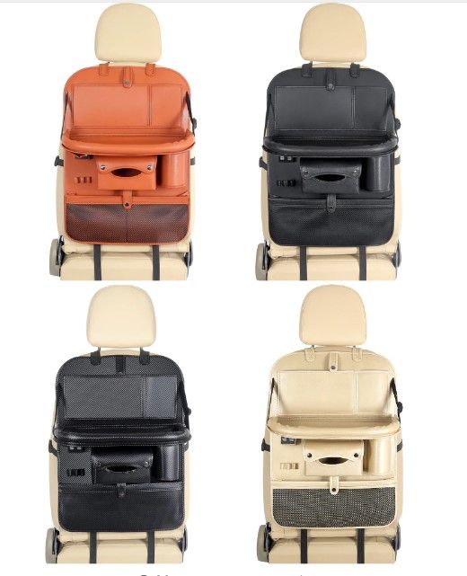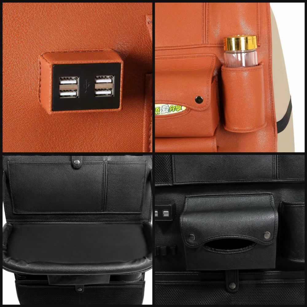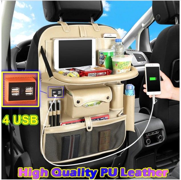 High Quality Leather Car Seat Organizer (4 USB) Features: 4 USB charging port can offer the back seat passenger charging electric appliances. Multi-function car seat back organizer, large storage space. Convenient for you to store magazines, tissue, CD, drinks, snacks, pen, phone, umbrella in it. Foldable shelf design (Option), easy to save and conveniently to enjoy food or snacks. 3.3kg load-bearing shelf (Option), you can put several beverages on it at the same time. Made of durable PU leather, won't scratch your car seats, good performance and stability. Portable to carry, makes traveling comfortable and trouble free, this organizer is a great addition to your vehicle. Easy to install, fit for most car backseats, it is universal. Specification: Type: Car Seat Organizer Material: High Quality PU Leather Quantity: 1pc Item Color: Black, Brown, Beige, Carbon Fiber Size: 60x44 cm 4 Colors (with Foldable Shelf): Black, Brown, Beige, Carbon)