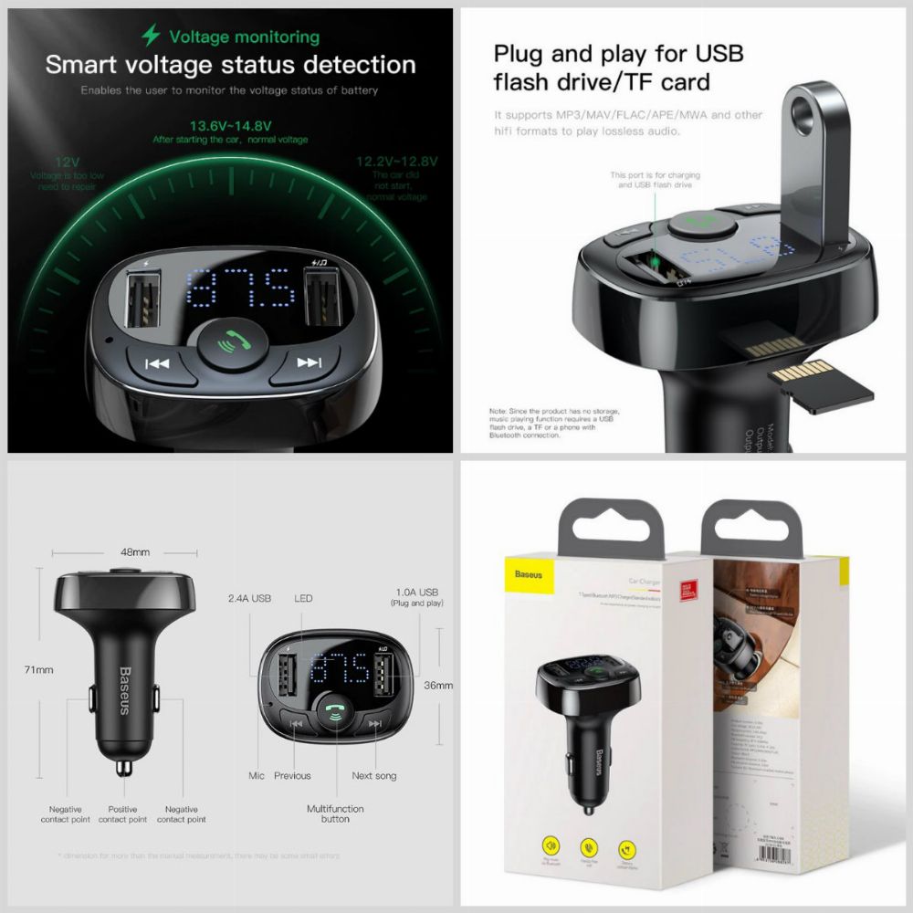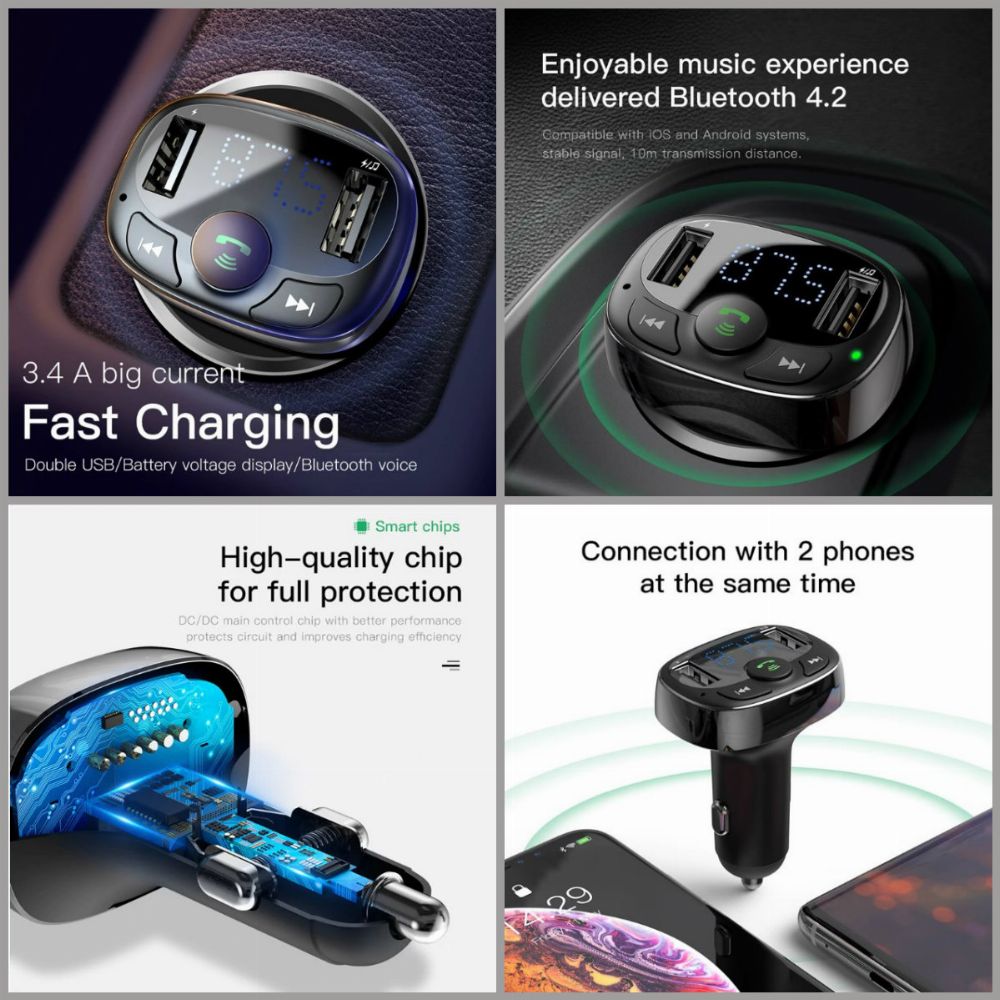 A Dual USB Car Charger with FM Transmitter Phone Charger Bluetooth Handsfree LCD Display FM Modulator MP3 Player Car Charger Description: Plug and play for USB flash drive /TF card. Dual USB 3.4A fast charging. Connection with 2 phone at the same time. Safer with one-key loudspeaker. Brand Name:BASEUS Compatible Brand: MEIZU, LG, Xiaomi, APPLE, TZY, ZTE, Nokia, SONY, Motorola, Other, Blackberry, Samsung, HTC, Lenovo, Huawei, Universal Model Number: FM Transmitter Bluetooth Car Charger Quality Certification: RoHS,FCC,CCC,ce Output Interface:USB Input:12-24V/2.4A Power Source:Car Lighter Slot Type:Car Charger Support Quick Charge Technology:No USB Ports:2 Output:5V/2.4A Function:Voltage Detection, Noise Cancellation,Bluetooth Car Adapter Aux Supported Audio File Types:MP3, WMA, APE, FLAC, WAV and other hi-fi formats Support 1:TF card, U Disk Dapacity Up To 32G Support 2:Car MP3 Audio Player, Audio Player, Bluetooth Audio Player Feature 1:FM Modulator, Car-Charger, 3.4A Fast Charging, For iPhone Charger Feature 2:Car Charger For Mobile Phone, Charger For Phone,Dual USB Fast Charger Feature 3:USB Car Charger, Car Charge, Car Charger USB,Baseus Car Charger Feature 4:For Xiaomi Car Charger, For Samsung Charger,Bluetooth 4.2 USB Charger Feature 5:Support Bluetooth Hands-Free Phone Calling Feature 6:Battery Voltage Display, Multi-function Bluetooth Car Charger User Tips: 1.It is a normal phenomenon that FM product will have some noise because of the interference of the local radio signal.Find a vacant or non-interfered frequency and sync Onever device to that frequency for minimized static noise. 2.To achieve best audio quality,please set the volume on your phone or the device to maximum and then adjust the volume for your car stereo;you are not suggested to adjust volume of your car speaker to maximum (this will bring lot noise). 3.Suggest that RAM less than 32GB. larger than 32GB which may cause the abnormal reading. 4.Our products support the use of 12-24V normal battery in the car/truck,we recommend that you do not use the product in car/truck that modified the battery.This may cause burned because of instantaneous high current. 5.To protect this device,we recommend to remove it from cigarette outlet after use,to avoid instant high start voltage damage the device. ​ ​6.If you want to charge the phone and listen to the car radio at the same time, please note that your radio frequency and our device's frequency do not get too close.