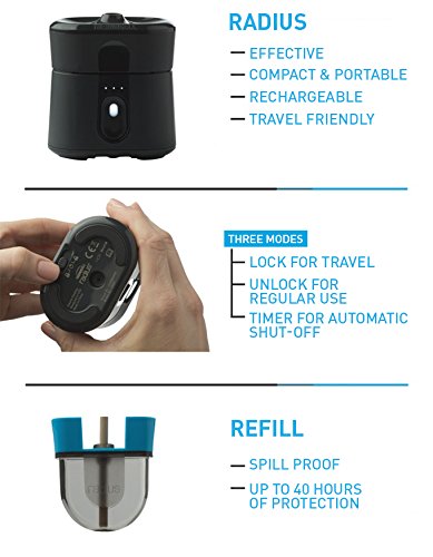 Radius is the first rechargeable, EPA-approved zone mosquito repellent. Radius works with a convenient 12-hour or 40-hour refill, operates for at least 6 hours per charge, and can be used while charging.