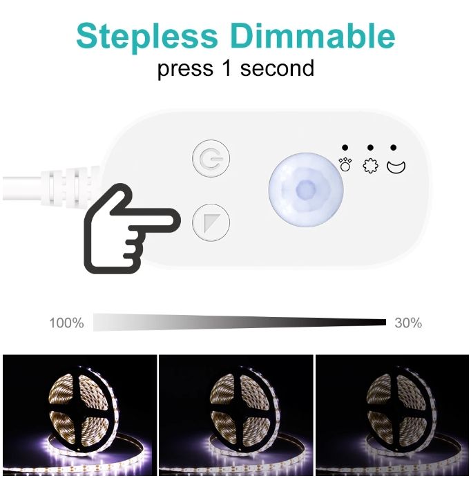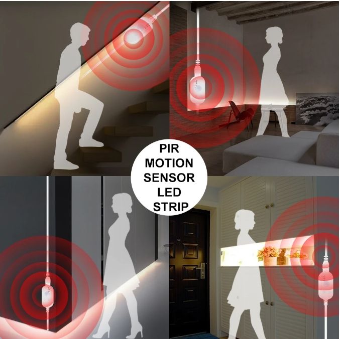 Features: * The outer layer of the light strip is transparent, clear and smooth. It is preferably environmentally friendly high-transparency latex, insulating plastic, high light transmittance, strong flexibility and safer. The material properties of the soft rubber make the lamp belt flexible and can be bent, folded and wound, which easily outlines the flowing linear light art. * The 3M double-sided tape on the back of the lamp belt can be directly and quickly pasted. * High color rendering LED chip, select high quality 2835SMD LED chip, high color rendering, low light decay, durable. * Anti-dead beads design, one LED lamp bead is not bright, other lamp beads are normally illuminated, unaffected. * Fully sealed and waterproof technology, it can be used in a variety of environments, safer and more durable. * Safety copper core wire, good electrical conductivity, fast heat dissipation, stable and safe. * Intimate tailoring lines to meet the length you want, you can arrange your ideas as you wish. Applications: *Home Decor: Light strips can be hidden in mirrors, ceilings, walls, floors, curtains, bookshelves, shelves or wardrobes in the dark trough, outline the space, enrich the layering of the space, give space to the beauty of the temperature in the dark, Make you feel warm and comfortable. *Commercial Use: It can be used in bar counters, shop cabinets, KTV scenes, setting off the texture of goods and creating an atmosphere. The contrast between the light and dark of the space and the holistic environment of the light environment is enhanced, and the spatial texture is more layered. Instructions for Use Button 1: Press once: red light on, the light strip always light on mode, never light off. Press twice: green light on, sun mode. Press 3 times: blue light on, moon mode. Press 4 times: the light strip off. Button 2: Press for 1 second, the light strip can stepless dimming. Three Modes: Always Light Mode and Sensing Mode (Sun Mode, Moon Mode) · Always Light Mode, the light strip is always on, and the sensing mode is off. With high-precision light control technology, the sensor is affected by ambient light. · "Sun" Mode, work for 24 hours whole day, not affected by light. When the product sensing human movement, it will auto light up. · "Moon" Mode, only work at dark. When the product sensing human movement, it will auto light up. Specification: *Voltage: DC 5V *Sensing Distance: 0 - 5 m *Waterproof: Yes (IP65) *LED Type: SMD 2835 * Length: 50cm / 1m / 2m / 3m / 4m / 5m *Light Color: Warm White/ Cold White *Color Temperature: Cold White (6000K-6500K); Warm White( 2700K-3500K) *Power Generation: Motion *Beam Angle: 180 degrees *Usage: with 3M strong adhesive paper on the back, it can be easily pasted * Dimmable: Three Adjustable Brightness * Power Supply: USB Powered Package: 1 x USB Motion Sensor LED Light Strip