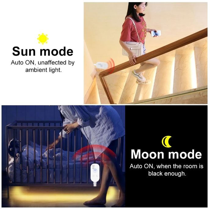 · "Sun" Mode, work for 24 hours whole day, not affected by light. When the product sensing human movement, it will auto light up.