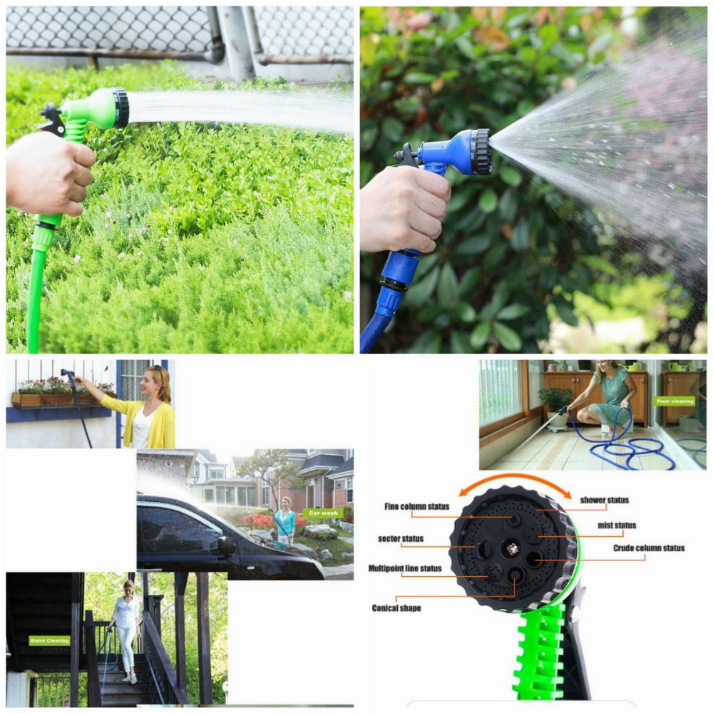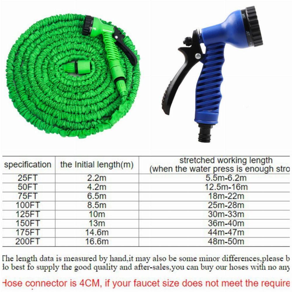 25FT-250FT Expandable Magic Flexible Garden Water Hose For Car Hose Pipe Plastic Hoses To Watering With Spray Gun This Expandalbe Garden Water Hose is made of durable latex, and this material makes the hose expands to 3 times its length when water flow entering and contracts in a few minutes when water flow off. In addition, this garden hose will never tangle, twist or kink, which is flexible and easy to handle and storage store. With 7 spraying water modes, pefect for watering flowers, washing car, cleaning floor, for instance. You will definitely love it. Great Features: 3 times expandable design, can be expanded from 15m up to 45m 7 spraying water modes, full, mist, jet, shower, flat, center, cone, choose optimal mode you need Wide application, suitable for washing car, watering flowers / vegetables, cleaming windows / floor etc. Latex tube, wear resistant, can be streched or bent High quality material, durable and lightweight,easy to operate Water pressure, 0 - 5 bar water pressure Note: The water hose length approximately 16.6m, after being filled with the water, it can be stretched length range about 48m - 50m. Color: Random Package weight: 1.165 kg Package size (L x W x H): 34.00 x 28.00 x 13.00 cm / 13.39 x 11.02 x 5.12 inches Package Contents: 1 x 25-200FT Expandalble Garden Hose Wate Pipe with 7 Modes Spray Gun 1 x Spray Gun
