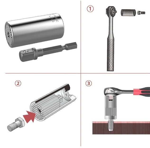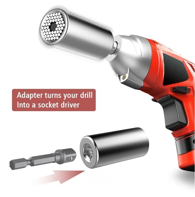 Universal Socket Set is a must have tool for the professional, the weekend repairer, or the do-it-yourselfer. Using 54 super strong, individually spring actuated steel rods that automatically conform to any shape, the universal socket instantly adjusts to grip hex nuts, hooks, eye and lag screws, bolt heads, and other various shape and size objects—no need to change sockets when adjusting different types of fasteners! Universal Socket fits both standard 1/4 to 3/4 inch and metric 7 to 9mm nuts and bolts, while the 3/8" included adapter turns any power drill instantly into a power socket driver.