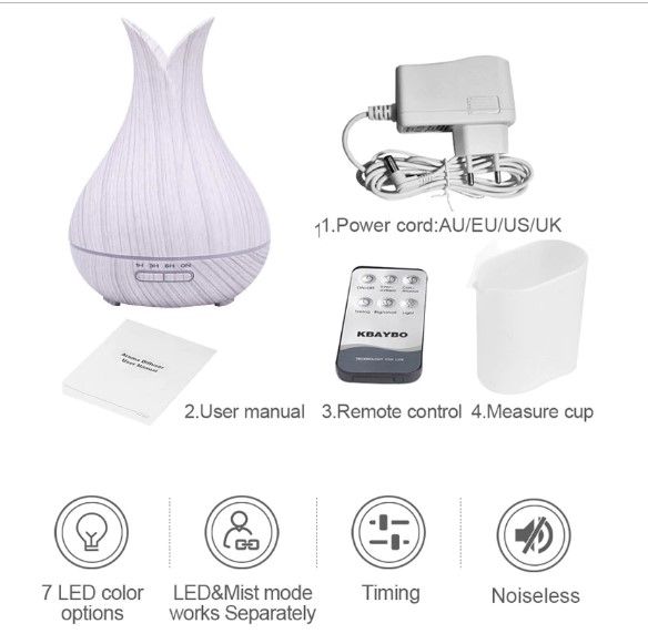 Advanced ultrasonic technology Advanced ultrasonic cool mist technology by inserting a unique 2.4MHz vibrating evenly to keep a best 50% air humidity and 215-270 sq.ft coverage, which gives you an all-round care. Home Decoration This streamlined vase diffuser can be perfectly blending into your home decoration. Matching with branches of flowers and drops of essential oils, it brings you relaxation and enjoyment from both visual and olfactory. Moisten Skin Are you still suffering from the dry air? This essential oil diffuser can definitely help you cut of that! Just due to a noticeable glow of diffuser mist. Humidify Air Diffuser can humidify air. It will be a ideal partner of your family life and give your every room a fresh scent. Reinforce immunity Feared at flu and cold? Do not hesitate to improve your breathing and strengthen the immune system by owning an 400ML essential oil diffuser. Relieve Stress & improve Sleeping 7 color creates a romantic atmosphere. Adding drops of oils, lying on bed, you can enjoy a peaceful night. Specifications Color: White Material: ABS/PP/PC Size: 168*240mm Shape: Vase Capacity: 400ml Working time: 10h LED Light: 7 colors Applicable area: 20-40 sql Rated Voltage: 24V, rated Power: 12W Lack of water and power protection: support Noise: Less than 36dB Remote control: Yes how to use? LIGHT Button press first: turn on the LED light, color changes automatically Press second: set the color on Press third: select dim or bringht color MIST Button Press first: continuous mist coming out Press second: 1 hour timer Press third: 3 hour timer Press four: 6 hour timer Note: Be sure to use a mild detergent if you want to clean the humidifier. Don't fill water over the Max line at any time. Don't switch on power when the tank is empty. Clean regularly as per Maintenance instruction to avoid malfunction. Maintenance instruction Add a small amount of warm kitchen detergent remover. Clean with water. use swab to wipe gently, and then use cleaning cloth to dry it lightly. What is included: 1. Power cord 2. User manual 3. Remote control 4. Measure cup