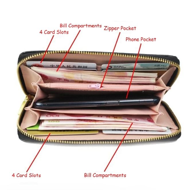 Internal structure: 8 card slots, 2 bill slots, 1 mobile phone slot, 1 coin zipper layer
