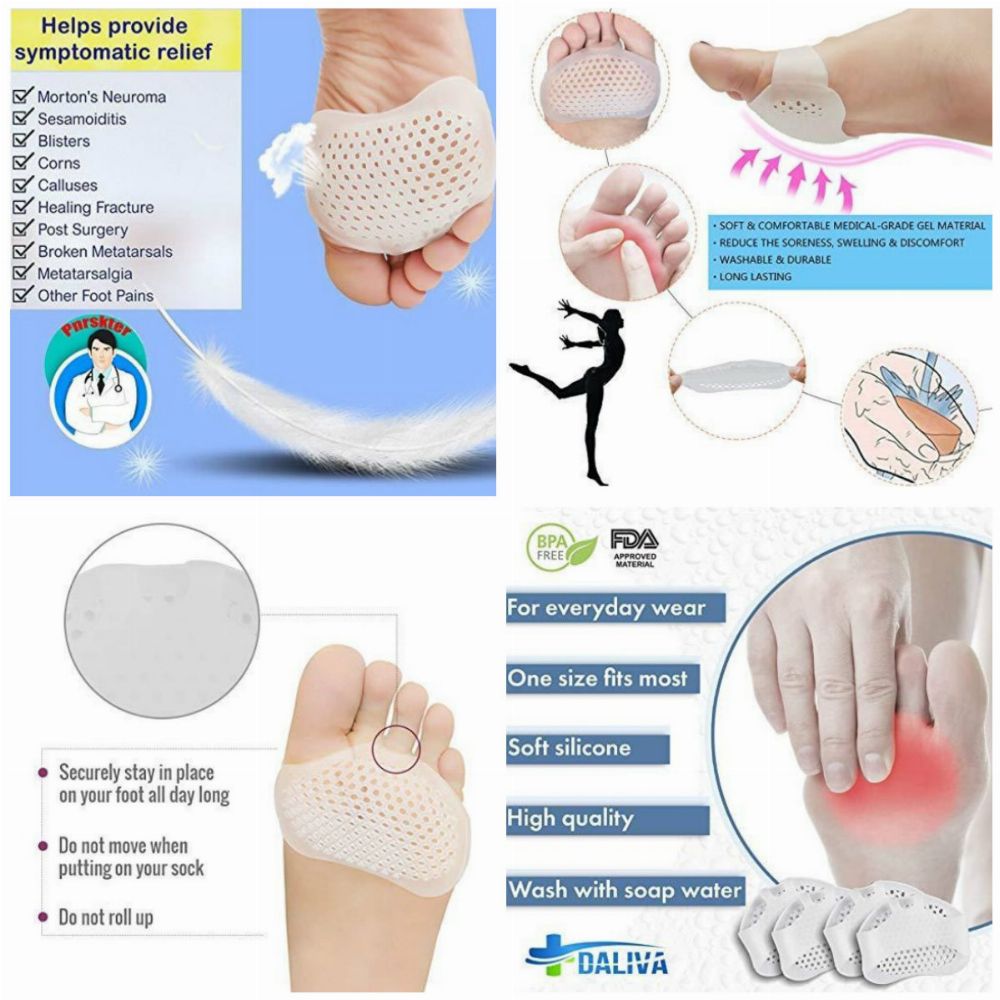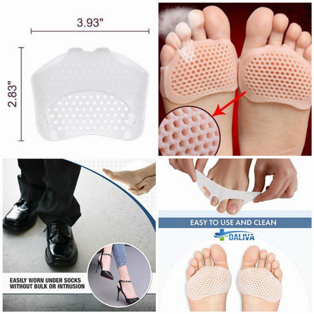 Say GOODBYE to your FOOT PAIN forever! Breathable - These gel pads are designed with special air holes to provide ventilation. Allows air to circulate and move freely making heat more bearable even while you are active or standing long hours. Our metatarsal pads helps address numerous foot & toe problems. ☞ Metatarsal pads help realign your metatarsal heads and the fat pad that's underneath them. ☞ Metatarsal pads are particularly helpful in treating capsulitis, sesamoiditis, and neuromas. ☞They are placed directly into the shoes to relax your foot and cushion the forefoot, metatarsal heads and ball of the foot. Reusable - Metatarsal cushions can be used inside socks, tennis shoes, boots and all other kinds of daily footwear. They are suitable for running, walking, hiking, cycling and any other physical activity. Product Details: Metatarsal Gel Pads Padded Cushion for the ball for the foot Adheres to your shoe, not your foot Latex Free, Washable, Reusable Unisex (Men and Women)