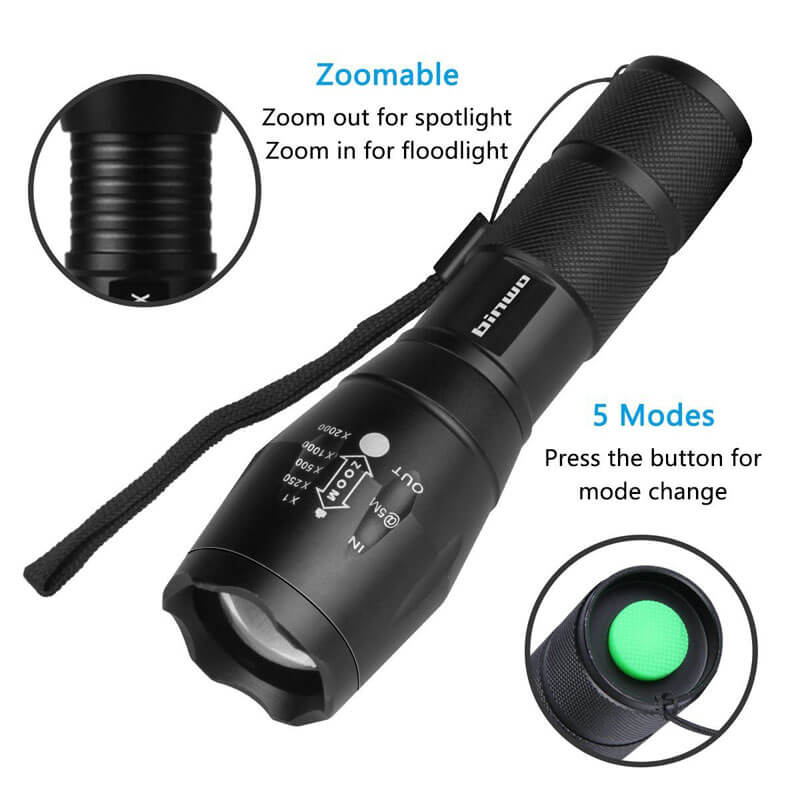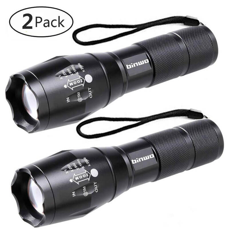 Shine a bright light on any subject with the Binwo LED Super Bright 2000 Lumen Tactical Flashlight. Sporting up to a 656ft beam distance with easy zoom and mode-switch, the waterproof flashlight provides a 50,000 hour LED lifespan for dependable and convenient light in any weather. Its compact size makes it perfect for camping, fishing, hiking, cycling, camping, or as part of your home emergency kit. Set of 2 flashlights. FEATURES * Body material: aluminum alloy. * Light source: 1 x CREE XM-L T6 LED bulb. * Mode arrangement: High>Mid>Low>Fast Strobe>SOS. * Reflector: aluminum reflector. * Switch location: on the tail cap. * Switch type: push-button switch. * LED lifespan: about 50,000 hours. * Battery: 1 x 18650 battery (not included) or 3 x AAA batteries (not included). * Inner circuit adopts efficient constant-current output circuits. * Support manual focus, for easy to operate. * Waterproof design, compact size, and convenient to carry. In the box: 2 x Zoomable LED Flashlight 2 x Plastic Sleeve