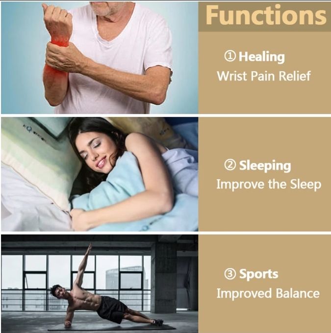 Health Care Bracelet Top Ten Effect 1. Promote cell metabolism, activate cells, and then speed up the excretion of intracellular waste and harmful substances. 2. Balance the body of the excretion system. 3. Promote blood circulation, improve microcirculation morphology. 4. Promote inflammation of the recession, eliminate inflammation swelling and pain. 5. Two-way conditioning blood pressure, in particular, can reduce the high blood pressure. 6. Improve erythrocyte oxygen carrying capacity, reduce blood viscosity. 7. Strengthen and improve the immune function of the human body, improve the body's resistance to disease. 8. Anti-aging effect, the elimination of the body of the backlog of free radicals. 9. Improve blood lipid metabolism, have lower cholesterol effect. 10. Eliminate the fatigue, to promote physical recovery. Condition: 100% new high quality Gender: man, woman Length: 21 cm Width: 1.3 cm Color:Gold/Silver/Black/Copper Who should wear this energy bracelet: *If you need to use your computer or mobile phone for a long time *If you have to focus on your work for a long time *If your job requires you to stand for a long time or do hard work, if you are a person who always has cold hands and cold feet * If you have nervous nerves, poor blood circulation, stiffness and pain in the shoulders and neck. * If you are weak against the disease and are prone to colds. * If you have a stressful lifestyle, want to relax and rejuvenate. * If you have an irregular lifestyle, you will often lose sleep. * If you like sports and want to develop your exercise and fitness. Note: This product cannot be immersed in water Package Included: 1 * Bracelet