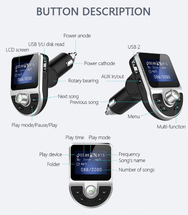 100% Brand New! Description: This is a new BT MP3 Player FM Transmitter Hands-free Car Kit, which releases stream music and calls directly from your BT device to your car FM stereo system. The built-in microphone provides you with an amazing hands free function, it is also with a Micro SD card/USB Disk slot that lets you enjoy favorite MP3 and WMA tunes by your car's stereo system. Features: Wireless transmit phone call from BT mobile phone to the car FM stereo system. Switch to Hands-free mode automatically from music playing status when receiving calls. Dual USB outputs totally, charges cell phone, GPS, MP3, tablets and other USB devices simultaneously. Full frequency FM transmitter, total support 208 frequency. LCD display and car battery voltage display. Support TF card/U disk MP3/WMA/WAV music play, support folder switch function. BT answer, hang up, reject, retail calls and other functions. Cancellation and noise suppression (CVC) technology during call. Automatic power-off memory function. BT stereo A2DP music play. Specifications: Material: Aluminum Alloy Color: Black-Silver Input Voltage: DC 12V-24V Working Current: 50-100mA USB Charging Output: 5V/3.1A(Max) PC Interface: High Speed USB Screen: LCD Display Support Micro SD Card/USB Disk: 32GB Support Format: MP3/WMA/WAV Bps: 64-320 kbps FM Transmitter Frequency: 87.5-108Mhz SNR: 85db(FM:65db) Harmonic Distortion: less than 0.05% FM: less than 0.1% Transmitting Distance: less than 5m Working Temperature: 0°-60° Package Weight: Approx.105g Fitment: For most 12V to 24V voltage vehicles Package List: 1 * Bluetooth Car MP3 Player 1 * 3.5mm Audio Cable 1 * User Manual
