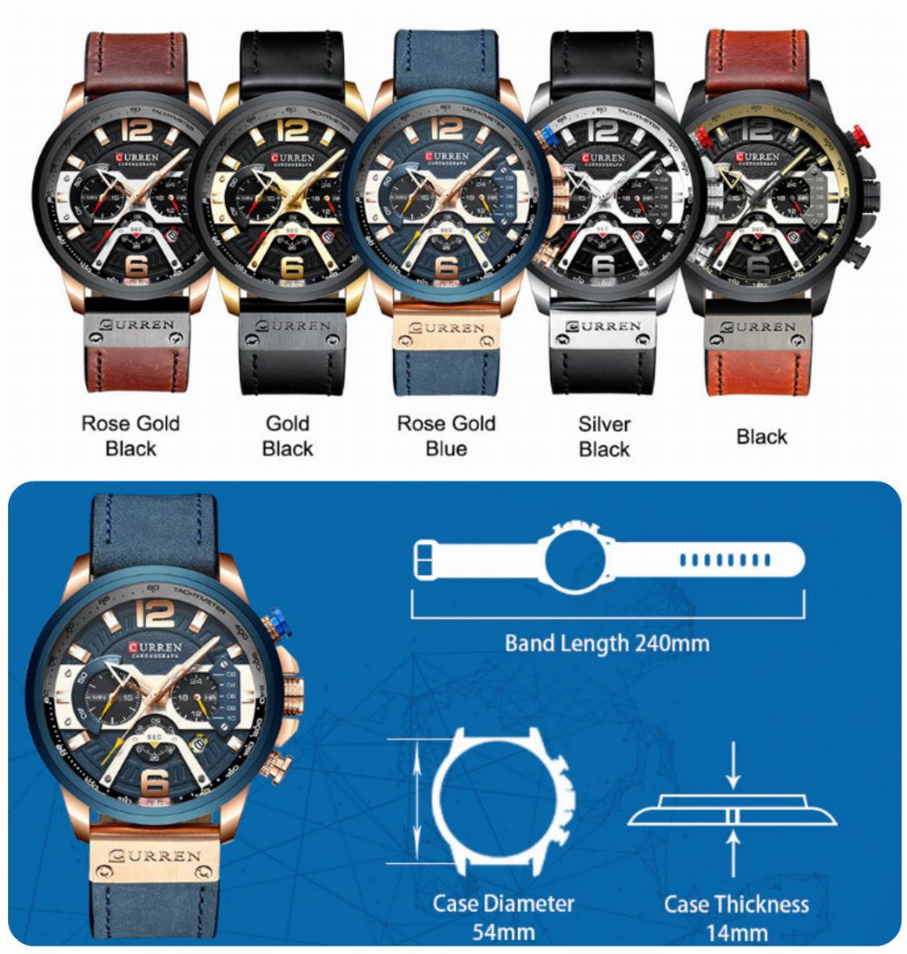 CURREN original men watch - 100% brand new label and high quality; - Top brand luxury high quality design dial, date display function; - Excellent in workmanship and elegant in style; - 3ATM / 30M waterproof ​ Features: All small dials are working Real chronograph, waterproof, calendar functions Stainless steel watch band Specifications: Dial diameter: 48 mm Case thickness: 14 mm Watch length: 240 mm Band width: 24 mm Watch weight: 100.6 g Water resistance: 30 M Features: Movement: Time Module quartz movement (Japan Made) Mirror Material:Hardlex 12-months movement guarantee Components Included: 1×Watch Kindly Notice: Multifunctional watch. All the pointers are working. This watch has a chronograph function. The watch waterproof 3bar can use to wash hand without hot/warm water, can't take shower, bath, swim etc