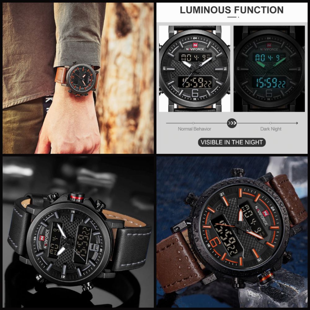 NAVIFORCE original men's watch - TOP SELLER Mulitifunction dual display quartz digital analog male clock. Watch Type: Men Watch / Military Watch / Calendar Watch / Digital Watch/ Quartz Watch / Fashion Watch/ Sports Watch/ Men's Watch/ Relogio Masculino/ Montre Homme Perfect for all kind of business, casual, outdoor sports, indoor activities or daily use, all small dials are working. Description Leisure Army Military design Men's watch Water resistant (Washing Hand) Date and Hours display High Quality Leather Band Alarm outpout with 4 min, Snooze Chronograph with and 1/100 lap operation Dual Core Analog and Digial display EL (Blue) function Hourly chime function Specifications Case Material: Stainless Steel Case Diameter: 46mm Case Thickness: 15mm Band Material: Leather Band Length: 250mm Band Width: 24mm Weight :102g What's Included 1 x Leisure Army Military design Men's watch