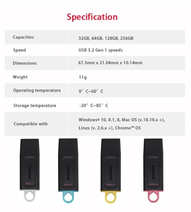 About real capacity 32GB = approximately 28GB-30GB 64GB = approximately 58GB-60GB 128GB = approximately 119GB-120GB This is calculation difference between manufacturer and your PC, please Google 'Memory card capacity' to get more information. Your PC says 1GB = 1.073741824 Billion bytes where Market Defines 1 GB = 1.00 Billion bytes. The pursuit of the perfect person is not recommended to buy. DataTraveler Exodia USB Flash Drive with Protective Cap and Keyring in Multiple Colors Kingston's DataTraveler® Exodia features USB 3.2 Gen 1 performance for easy access to laptops, desktop PCs, monitors and other digital devices. DT Exodia allows quick transfers and convenient storage of documents, music, videos and more. Its practical design and fashionable colors make it ideal for everyday use at work, home, school or wherever you need to take your data. DT Exodia is available in capacities up to 256GB and is backed by a five-year warranty, free technical support and legendary Kingston® reliability. Large loop easily attaches to key rings Practical cap protects the USB plug Multiple color options by capacity Specification: 1.Brand:Kingston 2.Series:DataTraveler 100 G3 3.Model:DT100G3 4.Capacity:32GB,64 GB,128GB,256GB 5.Interface:USB 3.0 Type-A Gen 1 6.Backward Compatible: with USB 2.0 7.Read speed up to 70MB/s 8.Design1:Capless Design Means There Is No Cap to Lose or Misplace 9.Design2:Quick and Easy to Use 10.Operating Temperature Range:0°C - 60°C 11.Storage Temperature Range:-20°C - 85°C 12.Dimensions:60 x 21.2 x 10 mm 13.Write speed up to 10MB/s In package: 1* Flash Drive