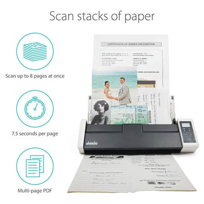 Engineered for ultimate simplicity, the Doxie doesn't require a computer or special drivers to work—everything you need is included on the device, including a rechargeable battery, a collapsible automatic document feeder, an 8 GB SD memory card, integrated Wi-Fi, and apps for Mac, PC, and iOS apps. Sync scans via USB or Wi-Fi to your desktop to organize and create searchable multi-page PDFs with award-winning ABBYY OCR technology. Save scans to your desktop, local apps, or your favorite cloud services like Dropbox, Evernote, OneNote, and iCloud Drive. You can even sync scans to your iPhone or iPad to save and share your scans wherever you are. When you're done, simply tuck your Doxie in your bag or a drawer.