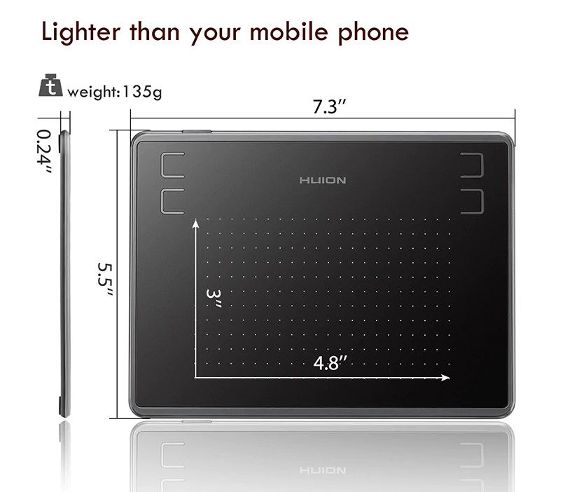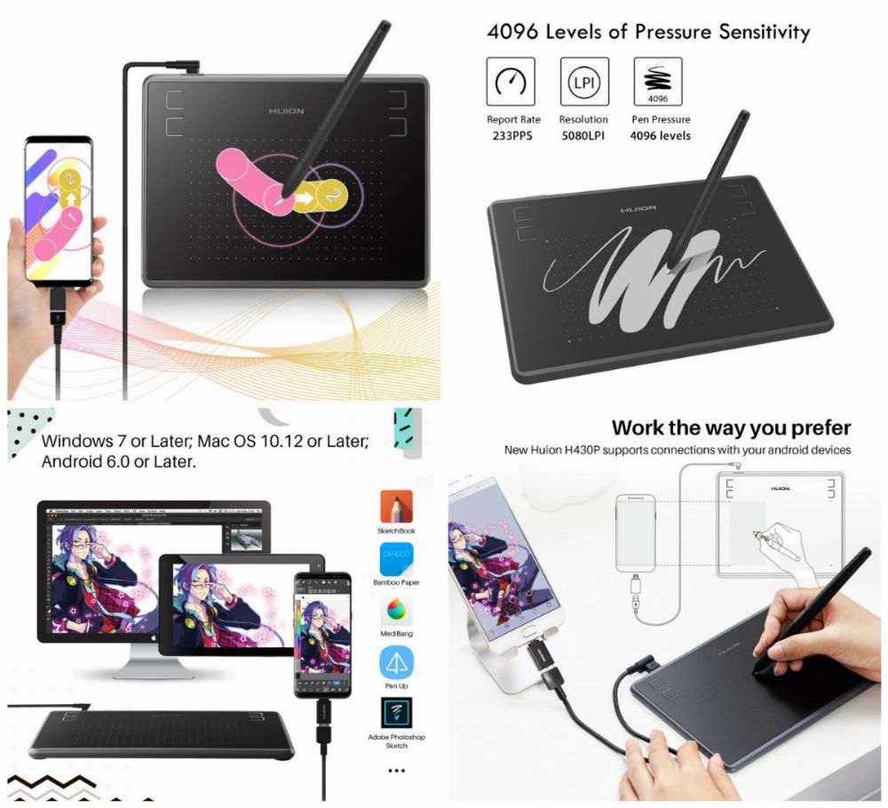 Designed for playing Osu! Game, digital drawing, painting, signature Battery-free Pen Recognize 4096 Levels Pen Pressure 2 times increased in pen pressure Compact Design: 4.8 x 3 inches in working area, 135g in weight lighter than a mobile phone. 4 express keys can be customized per your request to improve work flow. Compatible with Windows 7 or above /Mac OS 10.12 or above/ Android 6.0 or above( NOT suitable for IPhone/IPad). NOTE: The cursor does not show up in SAMSUNG device at present (except SAMSUNG Note Series), such as: Google Nexus SAMSUNG Galaxy S6/S7/S7 edge/S8 SAMSUNG Galaxy Tab S2 Battery-free Pen with 4096 top levels pen pressure Battery-free Pen: passive technology applied and there is no need to charge and no need battery any more. Never worried about interrupting when drawing or Osu! Game play. 2 buttons on the pen can be set and the it is light to hold. 4096 levels pen pressure, 5080LPI, 233PPS offer responsive and accurate performance in drawing. Pen drawing on the tablet can move the cursor on your PC. It is a nice replacement of traditional mouse. Portable tablet with 4 express keys Small and handy tablet with working area 4.8” x 3”, 135g in weight and 6.3mm in height. It is lighter than a mobile phone. 4 Shortcut keys: can be customized to undo, choose brush, paste etc. It is designed to improve work efficiency. Tablet for Osu! game play, digital draiwng, painting, drawing Huion H430P must connected to a PC/Mac to work. It can be widely used in Osu! Game play, digital drawing, sketching, painting in PS,SAI, and many other drawing programs. I t even can be use for handwriting, signature in Microsoft office, Excel, Word ect. OS Support Drawing Program Support OS support: Windows 7 or later, macOS 10.11 or later D rawing Software Support: Corel Painter, CorelDraw, Adobe Photoshop, Adobe Illustrator,Adobe Fireworks, Macromedia Flash, Comic Studio, SAI, Paint tool sai, Infinite Stratos, 3D MAX, Autodesk MAYA, Pixologic ZBrush Features: Battery-free pen, no need to charge or battery, allowing continuous use in game play and drawing. 2 buttons on the pen can be customizable. 4.8 * 3 inches in working area, 135g in weight and 6.3mm in height. 4 express keys can be customized per your request to improve work flow. 4096 levels pen pressure, 2 times increased in pen pressure offer more accurate and responsive performance. Designed for playing osu, game, digital drawing, painting, signature in Microsoft Excel, Word. Nice for kids, students and amateur in digital art. Specifications: Main color: black Item size: 187 * 140mm / 7.4 * 5.5in Item weight: 135g / 4.8ounce Package size: 250 * 200 * 100mm / 9.8 * 7.9 * 3.96in Package weight: 400g / 0.9lb Package list: 1 * Drawing Tablet 1 * Pen