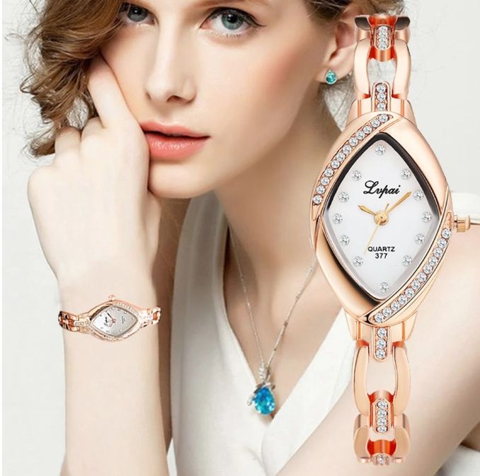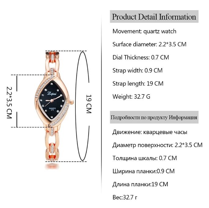 Product Name :Woman's Luxury Brand Quartz Crystal Watches Movement: quartz watch Dial diameter:1.9*2.3CM Dial thickness: 0.7CM Strap width: 1.1CM Band length: 20CM