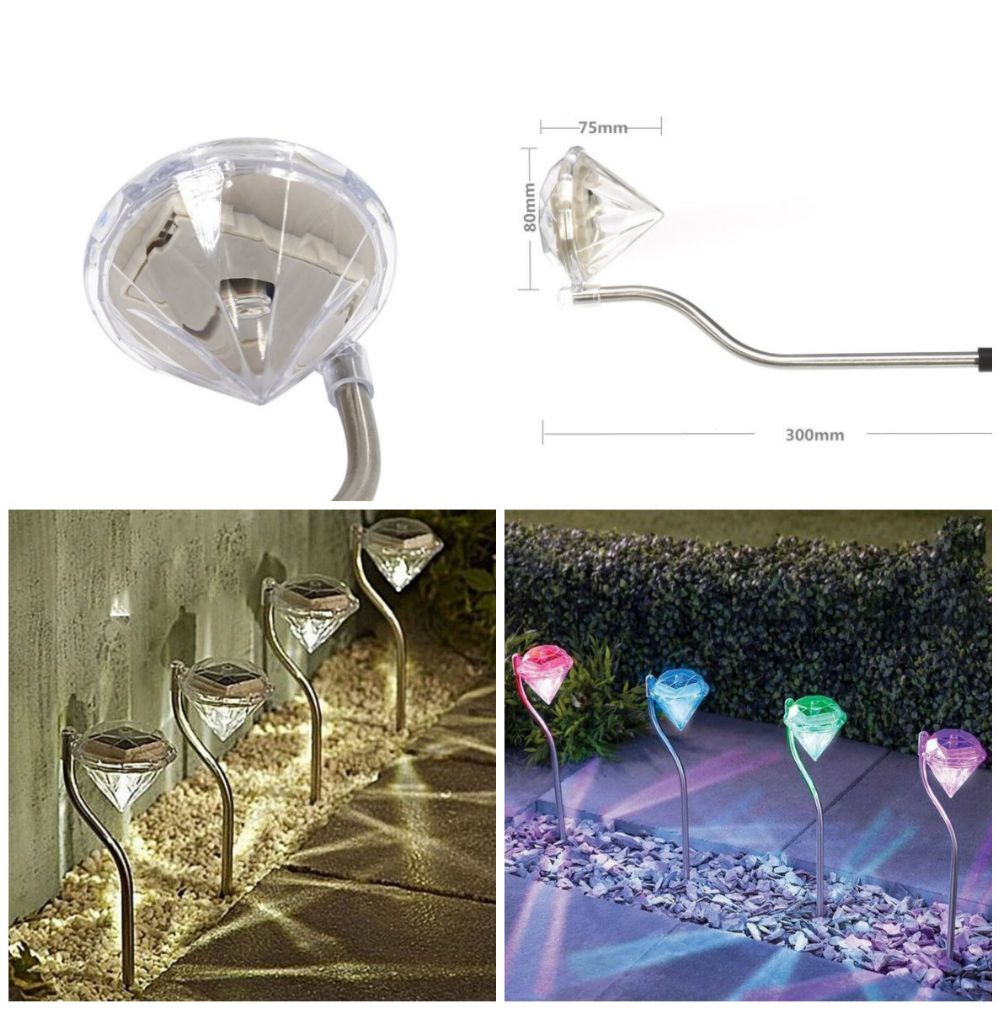 Features: Color: As shown by photos (Real color could be a little bit different from photos due to screen reflection) Specification: Diamond Lamp Sizer: 8 cm * 6.5 cm Whole Size: around 29.5 CM long, around 8 CM wide (As shown on the picture) Material:PC + ABS +Stainless steel Battery :NI - MH AAA batteries Light source: amorphous silicon solar panels. Lights last six to eight hours Switch ON/OFF photo sensitive automatically Package list: 4 Pcs Solar LED diamond light