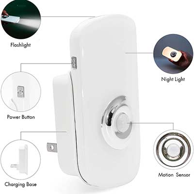 Navigate paths, hallways, stairways, and walkways safely with the Sensky 3-in-1 Motion Sensor Night Light. Providing automatic illumination of dark or low-lit areas, this night light can detect movement up to 3 meters away and shuts down after 25 seconds of inactivity. It also doubles as a rechargeable flashlight and emergency lighting for power outages. A built-in 500mAh lithium polymer battery ensures the nightlight stays fully charged and ready for use. PRODUCT SPECIFICATIONS: * Item Weight: 5 ounces * Package Dimensions: 7.01 x 4.8 x 1.34 inches * Battery: 1 Lithium ion * Material: Plastic * Power Source: Battery Powered * Wattage: 1.85 watts * Type of Bulb: LED * Special Features: Motion-Sensor