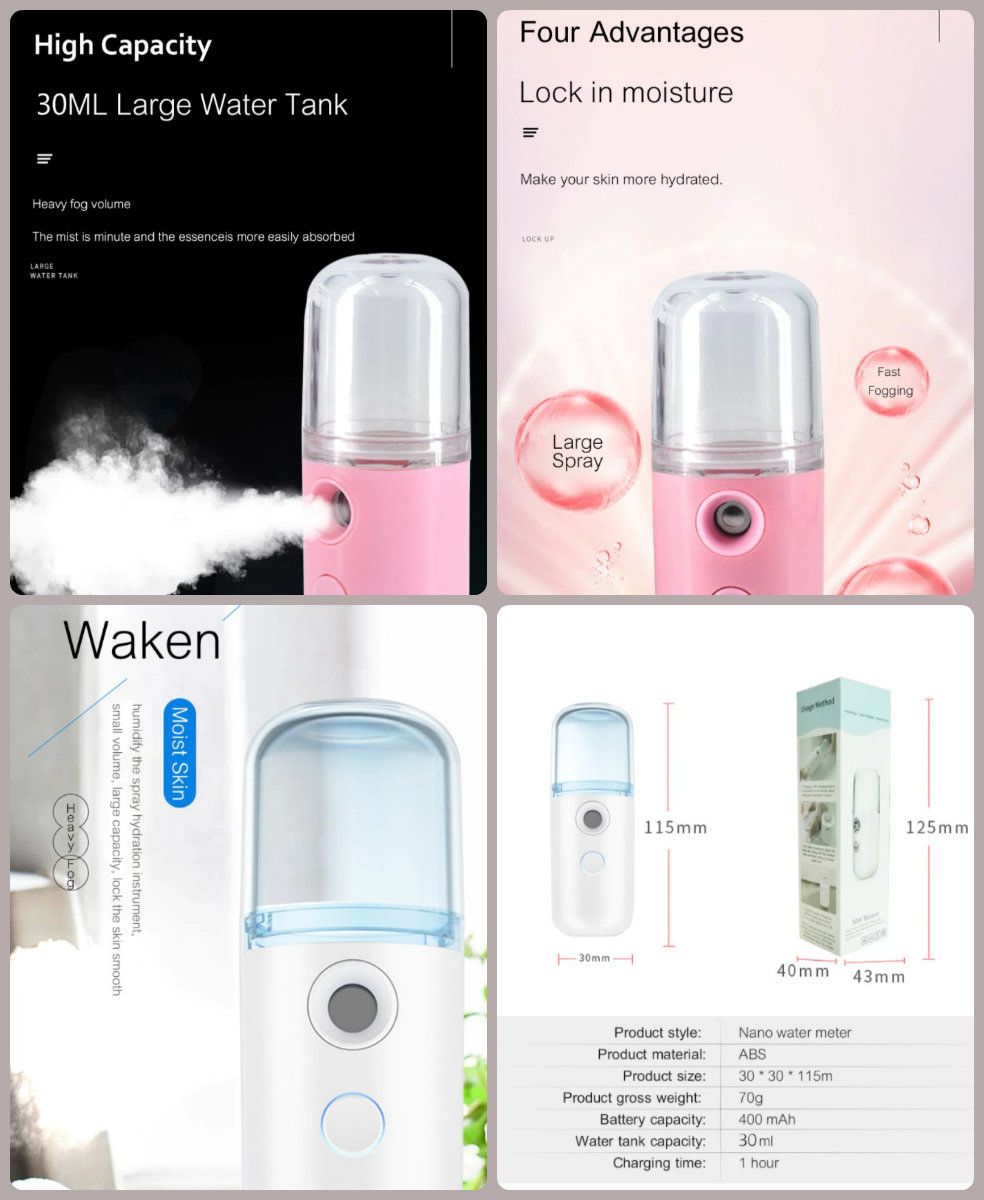 Features: 1. The spray is delicate without makeup. 2. Quickly absorb and moisturize the carry-on. 3. Large 30ml water tank with long spray duration. Description: 1 minute timing, moderate hydration keeps skin in its best condition. Product style: Nano water meter Product material: ABS Product size: 30 * 30 * 115mm Net weight: 50g Product gross weight: 70g Battery capacity: 400 mAh Water tank capacity: 30 ml Charging the sword: 1 hour Color box size: 125 * 40 * 43mm Package: 1*Water replenishment meter 1*charging cable 1*manual