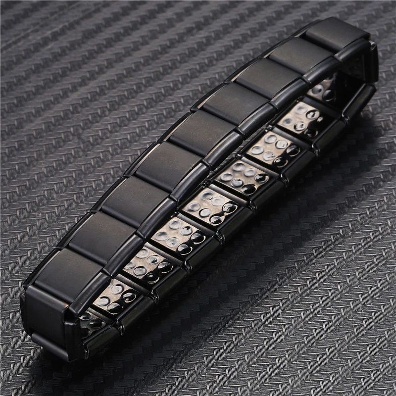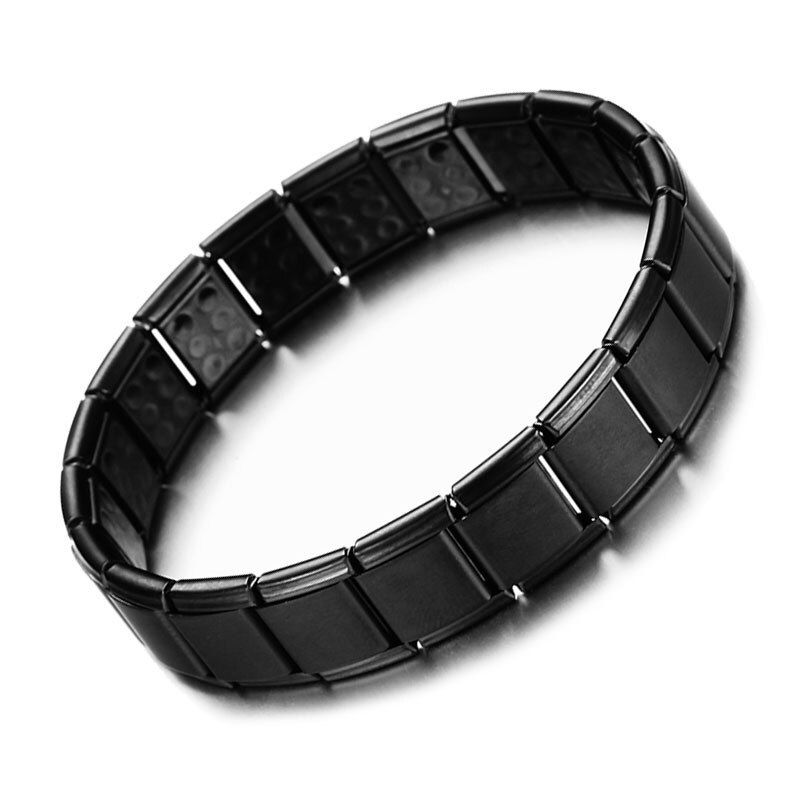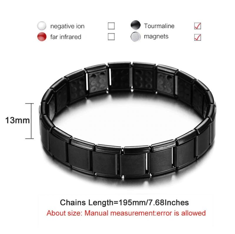 Black Stainless Steel Elastic Arthritis Magnetic Therapy Bracelet This bracelet has 3 rows with germanium tourmaline stones Description: Type: Black Germanium Magnetic Men/women Bracelet Material: Stainless Steel Color: Black Color Length: About 18-25cm(Adjustable) Width: About: 13 mm Weight: About 32g Features: 1. Anti-fatigue, anti-radiation 2. Enhanced energy 3. Health care Package Includes: 1xPower Bracelet Notice: 1.Due to the difference between different monitors, the picture may not reflect the actual color of the item. Please consider this before the purchase. 2.Please allow slight deviation for the measurement data. Who should wear This product: * If you have to use a computer or a cell phone for a long period of time * If you have to keep focused on your work for a long period of time * If your job requires you to stand or do laborious work for a long time and if you are a person who always has cold hands and cold feet * If you have problems such as tense nerves, poor blood circulation, or stiffness and shoulder and neck pains. * If you are weakly resistant to illnesses and catch colds easily. * If you have a stressful life style and want to relax and regain your energy. * If you have an irregular life style and are often sleepless. * If you are fond of sports and want to develop your sport fitness.