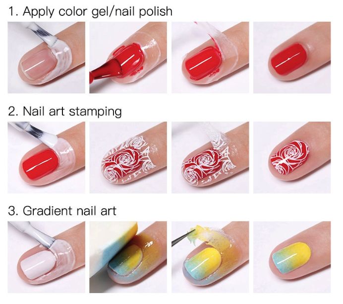 Create a perfect nail art with this peel off liquid tape that avoids the nail polish to stain your cuticle and fingers. Just apply,let it dry and peel it off.