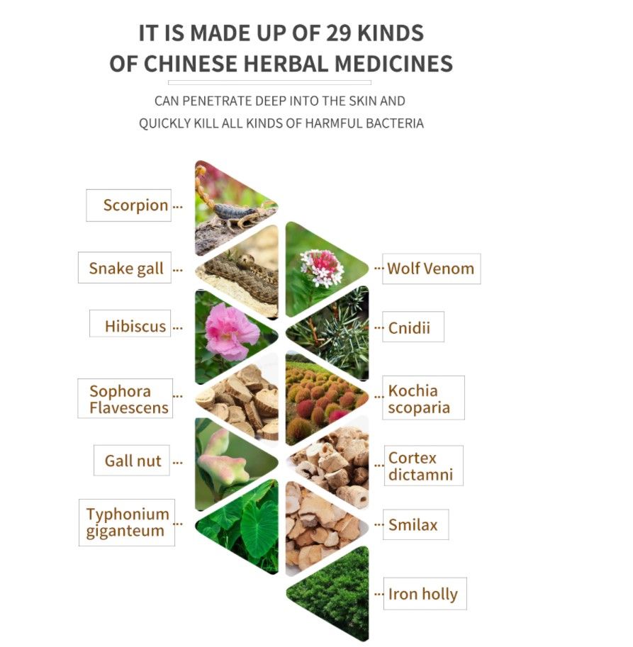 It is made up of 29 kinds of Chinese herbal medicines. According to Chinese folk secret recipes for thousands of years, it has been refined by a number of medical doctors after many studies and improvements using modern high-tech nanotechnology. Can penetrate deep into the skin and quickly kill all kinds of harmful bacteria