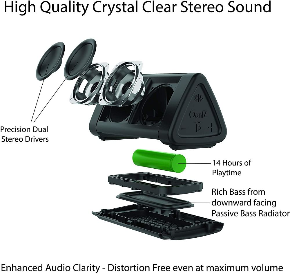 HIGHER QUALITY CRYSTAL CLEAR STEREO SOUND - The OontZ Angle 3 is Designed and Engineered by Cambridge Sound Works in the USA for greater clarity sound, accurate mids, and clear highs from dual precision acoustic stereo drivers; the bass output is enhanced by our proprietary passive bass radiator; unique triangular design and downward-facing bass radiator further enhance the sound quality; the Higher Quality Crystal Clear Sound & Features distance it from the competition.