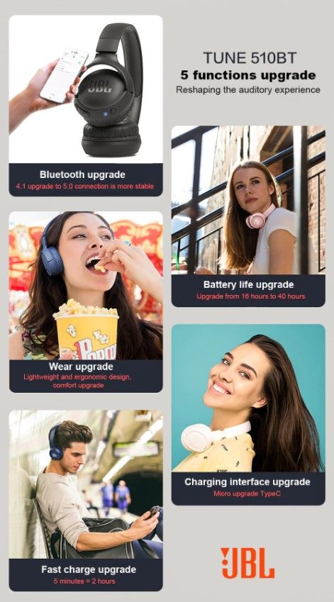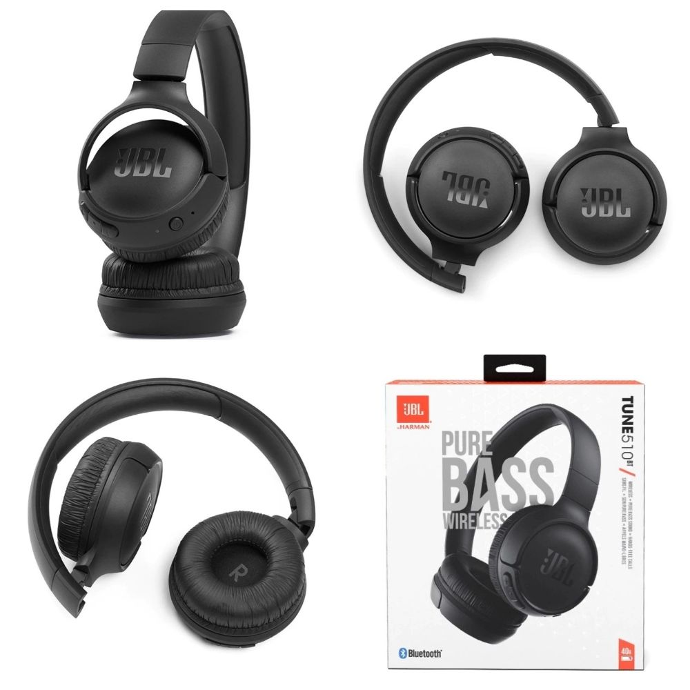 JBL Tune 510BT Wireless Bluetooth On-Ear Headphones JBL Tune 510BT wirelessly stream high-quality sound from your Bluetooth enabled devices. The headphones features renowned JBL Pure Bass sound that provides great sound either you are watching a video or listening to your favourite tunes. With multi point connection you can effortlessly switch from one Bluetooth device to another. Easily control your sound and manage your calls from your Bluetooth headphones with the convenient 1-button remote with microphone. The headphone is lightweight and features soft ear cushions with a padded headband making it comfortable to wear for extended periods. The foldable design makes it convenient for you to carry your headphones anywhere. Listen wirelessly for up to 40 hours and recharge the battery in as little as 2 hours and a quick 5-minute recharge gives you 2 hours of music. JBL Pure Bass sound for great sound quality Multi point connection to effortlessly switch between devices Soft ear cushions and padded headband for comfort Foldable design makes it convenient to carry around Up to 40 hours usage from a 2 hour charge Quick 5-minute charge gives you 2 hours of music Activate Siri or Google by pushing the multi function button Item specifics Condition: New Number of Earpieces: Double Features: Adjustable Headband, Built-in Microphone Model: 510BT Country/Region of Manufacture: China Color: Black, Blue, White, Pink Wireless Technology: Bluetooth Bluetooth Version: 5.0 Year Manufactured: 2020s Microphone Type: Built-In MPN: JBLT510BTBLKAM Connectivity: Bluetooth Brand: JBL Type: Ear-Cup (Over the Ear) Form Factor: Headband In package: 1x JBL headphones 1x USB charging cable