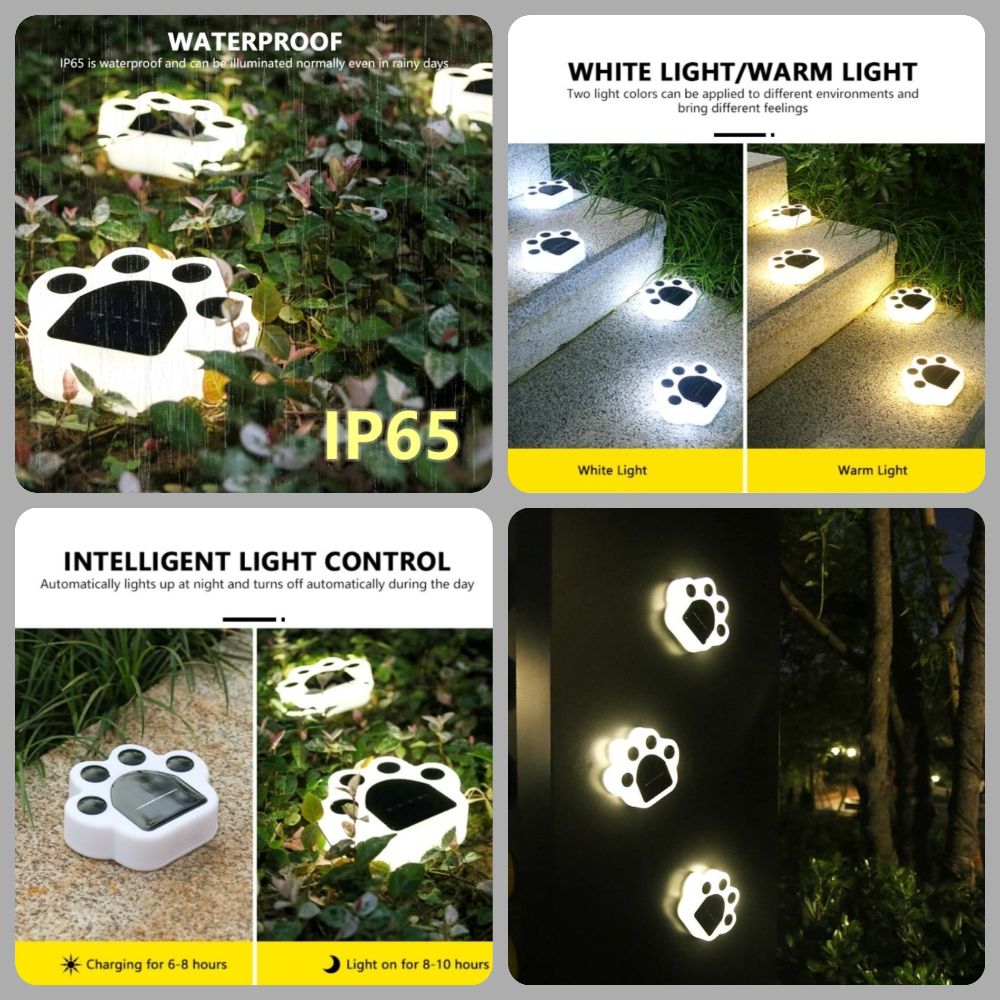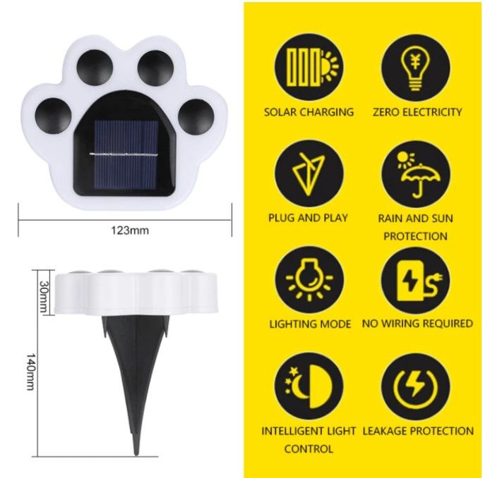 1.Cute Bear Paw Design Concept 2.Solar charging, automatically turn off the lights during the day, and automatically turn on the lights at night 3.High-grade ABS engineering plastic, high temperature resistance, corrosion resistance, rain and moisture resistance 4.IР65 is waterproof and can be illuminated normally even in rainy days 5.White light and warm light can be applied to various environments and bring different feelings 6.Super bright LED lamp beads, illuminate your courtyard Specifications: Type: Solar Bear Paw Light Charging Time: 6-8 hrs Lighting Time: 8-10 hrs Battery: 600mAh Product Material: ABS Color: White, Warm Use: Decorative lighting for wall, courtyards, parks and stairs Package Included: 4* Solar Bear Paw Light Notes: The following environment is not suitable for installation -Glass room (Although there is sunlight, the glass is blocked, which affects the light intensity. It affects the battery charging) -Monitoring area (the monitoring area is not suitable for installation, the monitoring has infrared rays. It will affect the brightness of the lamp -Under the tile eaves (the area where the lamp is installed must not be covered by tile eaves, trees, wires, etc.) AFTER PURCASE, PLEASE CHECK YOUR TripleClicks E-MAIL! We will send you a message with the order number and tracking data for your package.