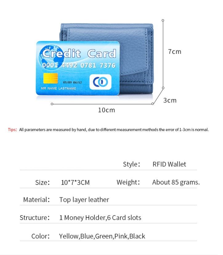 The First Layer of Cowhide Women Mini Wallet Rfid Blocking Credit Card Wallets for Men and Women Short Purse with Coin Pocket Real Leather Fashionable, simple and large capacity design. It can hold a lot of change. Strong practicability. Item Type: Wallet Closure Type: Hasp Wallets: Mini Wallets Decoration: NONE Main Material: GENUINE LEATHER Genuine Leather Type: Cow Leather Hardness.: Soft.Style: Japanese and Korean women's wallet Internal material: Polyester Gender: Unisex Wallet Length: Short Item Weight: 70 g Item Height: 7cm Width: 3 cm Item Length: 10cm Color: Red,purple,black,yellow,light pink,light blue,light green,dark green. Origin: CN(Origin) AFTER PURCASE, PLEASE CHECK YOUR TripleClicks E-MAIL! We will send you a message with the order number and tracking data for your package.