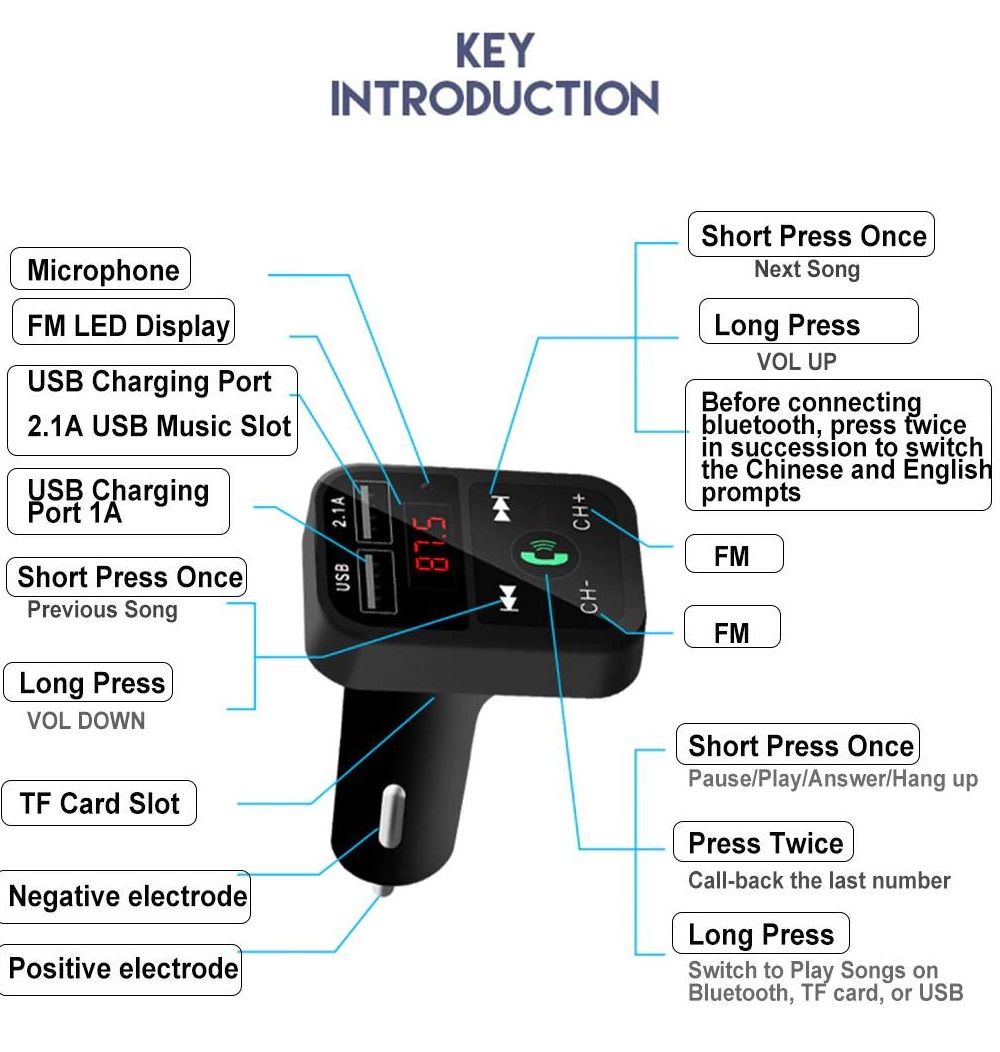 This product adopts FM full-frequency wireless transmission technology and can directly read the audio files in the mobile phone Bluetooth/TF card/U disk. Supports Bluetooth audio playback and Bluetooth hands-free calling. Support intelligent APP function, lossless high-quality audio decoding; usb car charging function in a multifunctional car MP3.