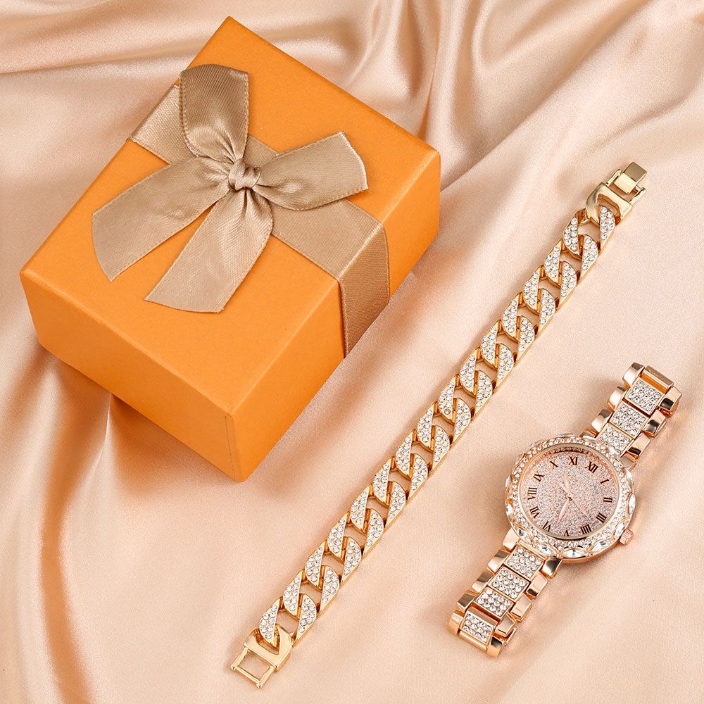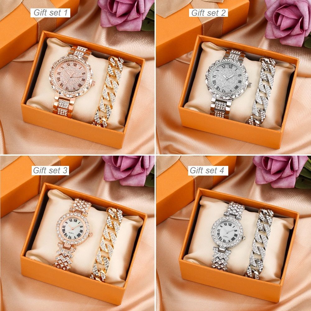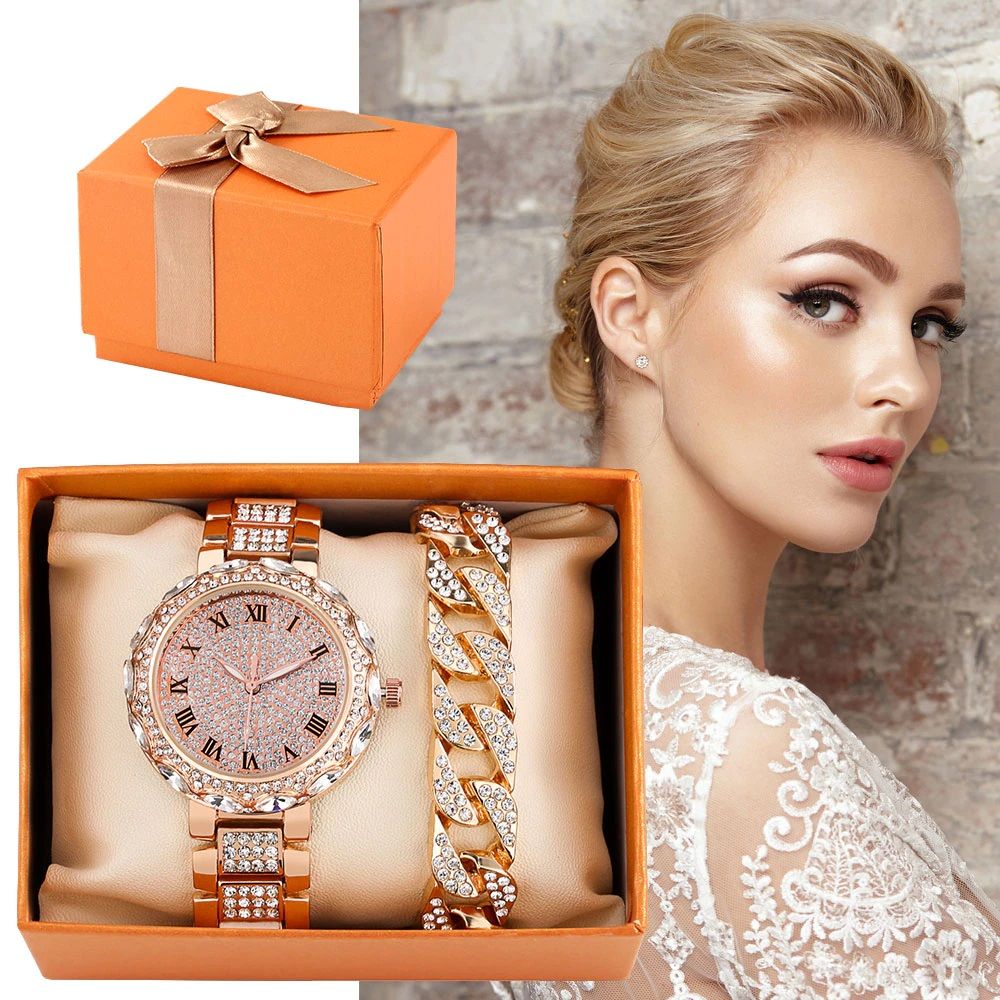 Bring elegance to every day with this sparkling watch and bracelet set that will make any look glamorous and stunning. This set from Keller & Weber consists of a watch and bracelet that fit together perfectly. The large amount of Rhinestone diamonds scattered over the accessories will turn heads everywhere. The Keller & Weber watch exudes femininity and elegance. The contrast between the hands and the dial creates a distinct look, with Roman numerals to mark the hour. The watch is also available separately. The dial is made of stainless steel and has a high-quality quartz dial that is equipped with scratch-resistant hardlex glass. Every detail has been carefully worked out so that the design comes into its own. The watch is very easy to use; you can adjust the time with the dial on the right side of the watch. Quartz dial Scratch resistant hardlex glass Specifications Brand: Keller & Weber Housing: Stainless steel Band: Stainless steel Dial diameter: 32mm Casing thickness: 10mm Strap length: 23 cm Tire width: 14mm Water Resistance Depth: 3Bar Package contains: 1x Rhinestone Diamond Watch 1x Bracelet