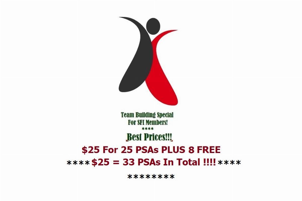 $25 FOR 33 PSAs (25 PSAs PLUS 8 FREE) Team Building Recruitment Especially For SFI Affiliates!!! International PSAs sign up from worldwide (most countries are excluded from Africa and Asia) -Key Code 1134 Only thing we need your SFI ID # , so your PSAs will promptly add into your team building downline members. All PSAs are real people sign up from Google Search Engine within time delivery from 72 hours to 5 days or longer. It depends on weekdays or weekends. It may take sooner or later. However, we can not predict nor guarantee they are all ACTIVE. These PSAs need to follow up by your attention, guidance, mentor… It depends on you how to support them, instruct them with your SFI Business. IMPORTANT NOTES: *All International PSAs sign up from worldwide exclude most countries from Africa and Asia. However, keep in mind that we can not guarantee that will be excluded 100 % from Asia & Africa. *In case of some affiliates will register twice by error or use fake email or opt out on the first day etc...However, the FREE EXTRA PSAs we give you to cover the one you paid for. DISCLAIMER: *That depends on Google Searching Engines behaviour! Google changes search terms from time to time. The PSAs are randomly fulfilled in the SFI Coop Manager System ( first come first serve basic with key code 1134) . Therefore, there is no guarantee the countries you expect for the cheap price even though I excluded more than 500 countries from Asia and Africa. *The larger PSAs package is more chance to get people SIGN UP from America and Europe but no guarantee like I mentioned above. It’s totally up to Google Search Engines behaviour. That is beyond my control. Please consider that before you place an order! Happy Shopping!
