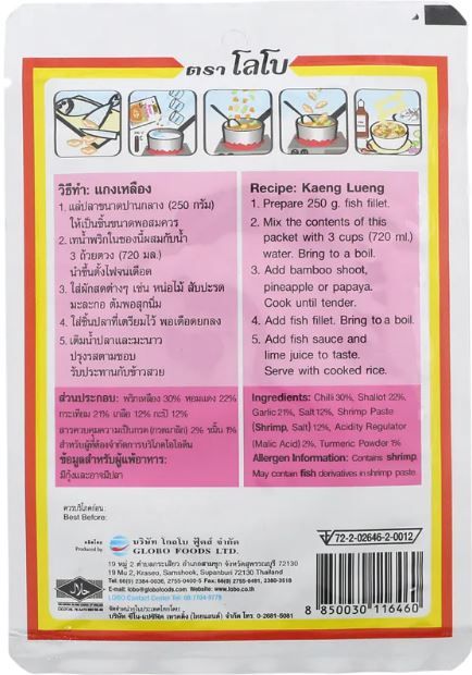 Lobo Yellow Sour Curry is in our opinion the most delicious curry. This a very hot and sour dish that works really well with any white Fish, or Shrimp, It is important to use fresh fish, as we will be boiling the fish in the paste, so if the fish is not fresh it will really spoil the taste. A lot of places will fry the fish to mask the lack of freshness, but frying harms the overall taste. Slightly spicy, and loaded with rich flavor, the consistency is smooth. We served it with sliced bamboo, We used freshly steamed bamboo, but a can works well too, see picture. 1 - heat 3 cups of water and add 1 package yellow sour curry paste. 2 - in a separate pot, combine 1 can sliced bamboo with cold water, bring to a boil, then strain the bamboo and rinse with cold water 3 - add bamboo to your yellow sour curry 4 - on a cutting board, slice one fresh Thai chilli pepper, a slice of fresh galangal and cut a piece of fish. Add this to your yellow sour curry paste and cook for 5 minutes 5 - garnish with sliced spring onion and serve with steamed jasmine rice The taste is rich in herbs and spices, and not nearly as fattening as curries made with coconut base. The convenient and inexpensive package is enough for 4 servings. Ingredients: shrimp paste, tamarind juice, dried red chilli, garlic, shallots, salt, turmeric. No MSG Product of Thailand.