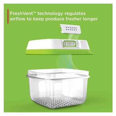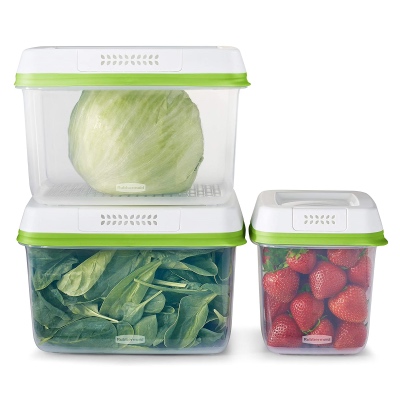 Rubbermaid FreshWorks Produce Saver Containers w/Lids keep produce fresher longer. The FreshVent technology filter naturally regulates the flow of oxygen and carbon dioxide to to create the optimal environment for your fresh produce. An elevated base lifts produce away from moisture and promotes proper airflow to prevent spoilage, while the modular, space-efficient design makes storage and kitchen organization easy—bases nest inside each other and one lid fits multiple bases to keep cabinets tidy. These plastic containers are BPA-free and dishwasher-safe for easy care. Set includes one 7.2-cup medium and two 18.1-cup large containers and lids.