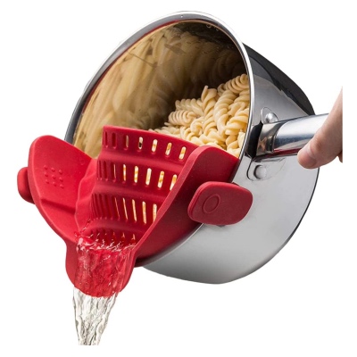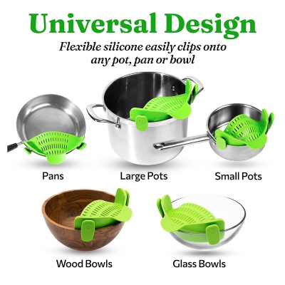 Take the strain out of straining with the original Kitchen Gizmo Snap N Strain Pot Strainer! This kitchen must-have is constructed from top quality, heat-resistant silicone and will last for years. Super easy to use, it features two specially designed clips that securely snap on to round pots, pans and bowls of all sizes, including lipped bowls. You can also leave it attached to a pot while cooking for quick straining of even heavier foods when ready. At just a quarter the size of traditional colanders, this small and compact strainer is great when working with limited counter space and folds up for easy storage in a drawer or cabinet. Completely BPA free and dishwasher safe. Available in a variety of colors.