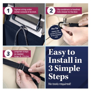 No more handbags falling on the car floor when you brake—the Car Cache Storage Organizer has you covered. This stylish hammock-style organizer keeps your purse, receipts, sunglasses, and other belongings secure and within reach while driving. Installs easily in vehicles with headrest posts on which to clip the carabiners, front-opening center consoles to tie the bottom strings, and enough room between the front seats for the net purse holder. Features a handy extra pocket for things like chargers, umbrellas, notebooks, snacks, toys, and whatever else you and your passengers need on the road. Also works great as a pet barrier to keep excited pups from jumping from the back seat to the front. Made from durable high-strength polyester blend, the organizer measures 16-inches wide and 14-inches wide. Machine washable. Available in black or tan. Makes a thoughtful gift for the busy driver.