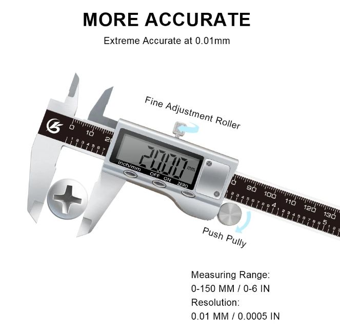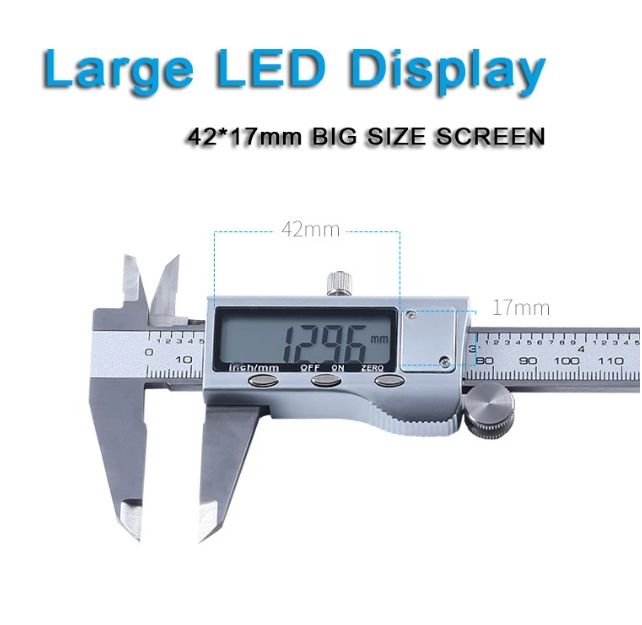 Electronic Digital Caliper Made of hardened stainless steel Internal, external and height dimensions can be easily and accurately measured Zero setting in any position Base measuring function: Inside, outside, depth and step measuring With easy to read large LCD display An ideal tool for a broad range of industrial and automotive applications Specifications: Measuring range: 0–150 mm/ 0–6 inch. Resolution: 0.01mm/ 0.0005 in. Accuracy: +/- 0.02mm/ 0.001 in (100-150mm) Repeatability: 0.01mm/ 0.0005 in. LCD Display Working temperature: 5-40 C Power: 1 x 1.5V LR44 (silver oxide cell) battery(No included) Note: Accutacy affected in environment exceeding 80% relative humidity No Backlight Package content: 1 x Digital Vernier Caliper 6 Inch 150mm ( No including battery ) NOTE: if you need the carrying box, please choose the carrying box option.