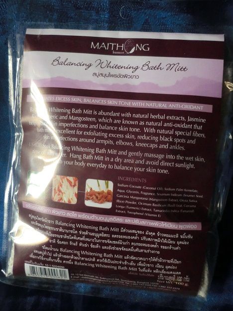 "Balancing Whitening Bath Mitt is abudant with natural herabal extracts, Jasmine Rice, Turmeric and Mangosteen, which are known as natural anti-oxidants that help reduce skin imperfections and balance skin tone. With natural special fibers, the bath mitt is excellent for exfoliating excess skin, reducing black spots and skin omperfections around armpits, elbows, kneecaps, and ankles.