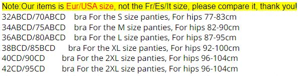 100% Brand New! Item Type: Bra & Brief Sets Gender: Women Decoration: Embroidery Pattern Type: Floral Style: Sexy Material: Cotton Support Type: Underwire Bra Style: One-Piece, Push Up, Plunge, Unlined Cup Shape: Three Quarters (3/4 Cup) Closure Type: Back Closure, Tow Hook-and-Eye Strap Type: Adjusted-straps, Convertible Straps Material: Lace Lining: 100% cotton Style: Sexy Bra Set Color:Black, Pink, White, Brown Sizes: 32/70 ABC (panties size S), 34/75 ABCD (panties size M), 36/80 ABCD (panties size L), 38/85 BCD (panties size XL), 40/90 BCD (panties size XXL) 42/95 CD (panties size XXXL) Package includes: 1 set = 1*bra + 1*Panties