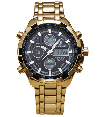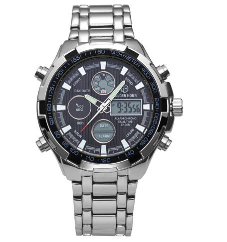 Brand Name: GOLDENHOUR Item Type: Dual Display Wristwatches Case Material: Stainless Steel Dial Window Material Type: Hardlex Water Resistance Depth: 3Bar Movement: Dual Display Dial Diameter: 47 mm Clasp Type: Folding Clasp with Safety Boxes & Cases Material: No package Gender: Men Style: Luxury Feature: Stop Watch,Back Light,Shock Resistant,Chronograph,Complete Calendar,Water Resistant,Alarm Band Material Type: Stainless Steel Case Shape: Round Band Length: 23 cm Band Width: 20 mm Case Thickness: 16 mm Model Number: GH-108 Color: Silver/Gold/Black Style: Fashion Luxury Movement: Dual Dispaly,Imported Japan Function: Alarm,24Hours,Date and day,Stopwatch,Backlight Waterproof: 30bar Waterproof,not for Diving Keywords: montre home,hombre reloj,hodinky,erkek saat,