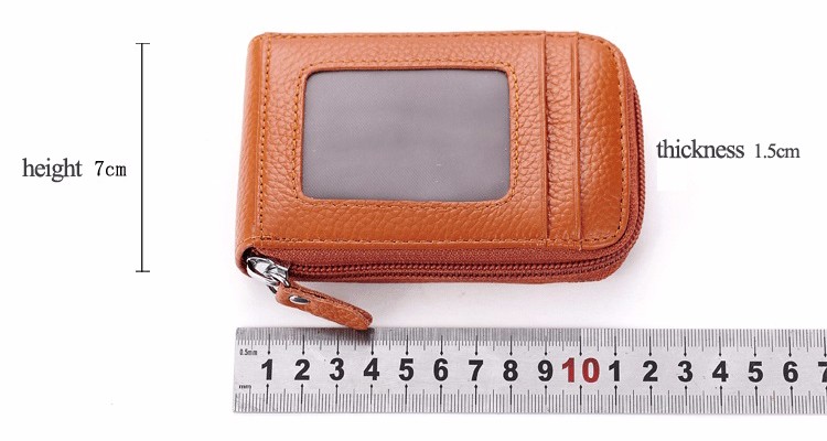 Feature: Material:Genuine Cow Leather Size:11x7x1.5cm Internal:9 cards pocket and 2 coin pockets. Weight(Approx): 80g Package includes: 1 X Card Bag Item specifics Item Type:Card & ID Holders Closure Type:Zipper Item Width:11 cmShape:Trunk Gender:Unisex Pattern Type:SolidStyle:Casual Main Material:Genuine Leather Use:Credit Card Item Length:7 cm Item Weight:65 g Genuine Leather Type:Cow Leather Material Composition:cow leather Model Number:WH2011 Package: 1x Wallet of your color choice