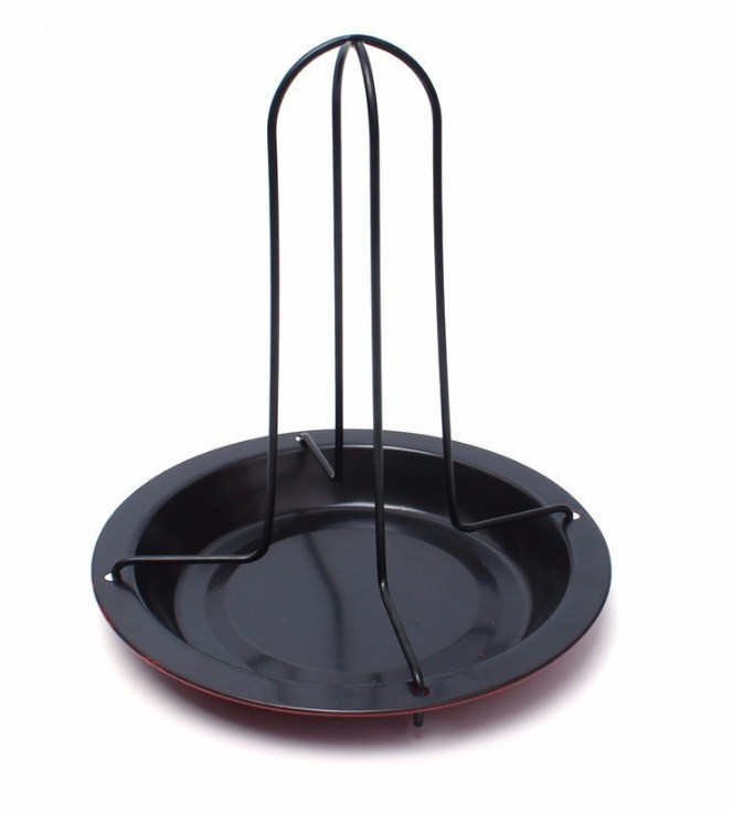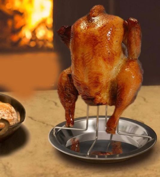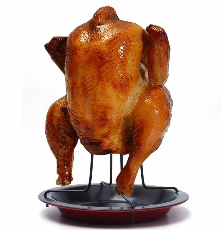 Place chicken upright onto the rack and the tin at the bottom catches all the fat.