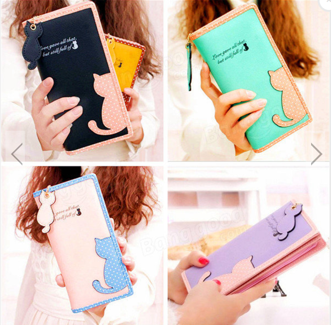 Women Cartoon Cat Long Wallet Girls Cute Animal Dot Purse Card Holder Phone Bags