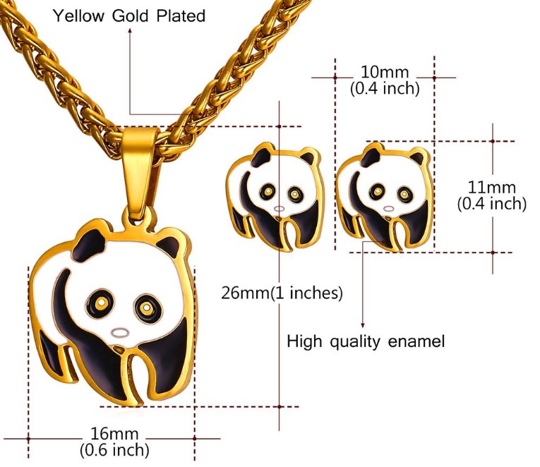100% Brand New! Brand Name: U7 Item Type: Jewelry Set Fine or Fashion: Fashion Occasion: Party Style: Trendy Gender: Women Metals Type: Stainless Steel Decoration Material: Enamel Shape\pattern: Panda Class: High Quality Length Of Chain: 50cm + 5cm (19.6" + 1.96") Net Weight: 17gr/Set Color: Gold Package Content: 1 Necklace, 1 Pair Earrings Package Weight: 0.08kg (0.18lb.) Package Size: 15cm x 12cm x 2cm (5.91in x 4.72in x 0.79in)