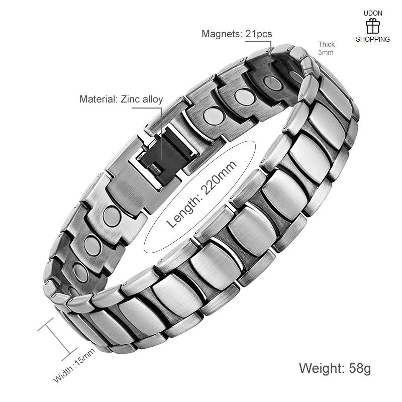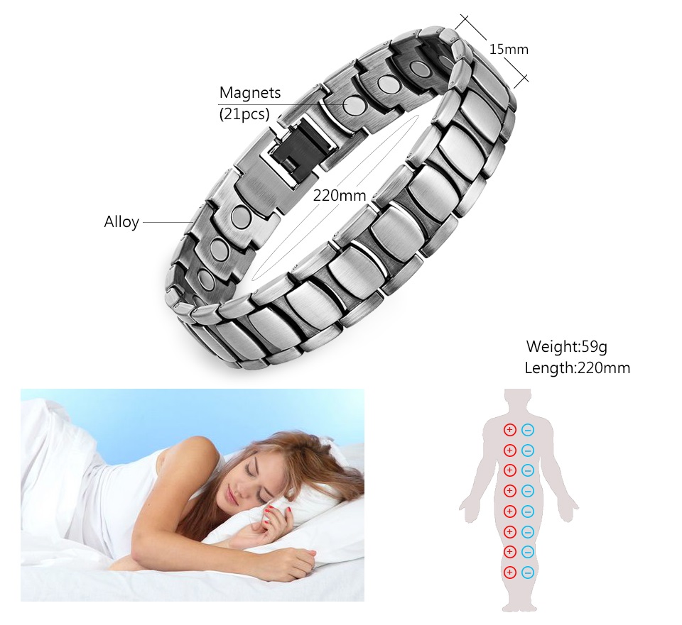 Classic Magnetic Heath Antique Silver Plating Zinc Alloy Men Bracelet MAGNETIC THERAPY Relive pain, Promote blood circulation, Optimum energy & stamina, Balance & harmony. Relieves fatigue and tiredness, Alleviates physical stress, striffness, cramps or discomfort. Relieves joint and muscle pain increases blood circulation. Magnet: Neodymium Number of Magnets: 21 Gauss Strength of each Magnet: 3,000gauss Bracelet Length: 22.5cm Bracelet Width: 1.5cm Gender: Men Supreme Quality Packaging Details Unit Type: piece Package Weight: 0.5kg (1.10lb.) Package Size: 27cm x 20cm x 1cm (10.63in x 7.87in x 0.39in)