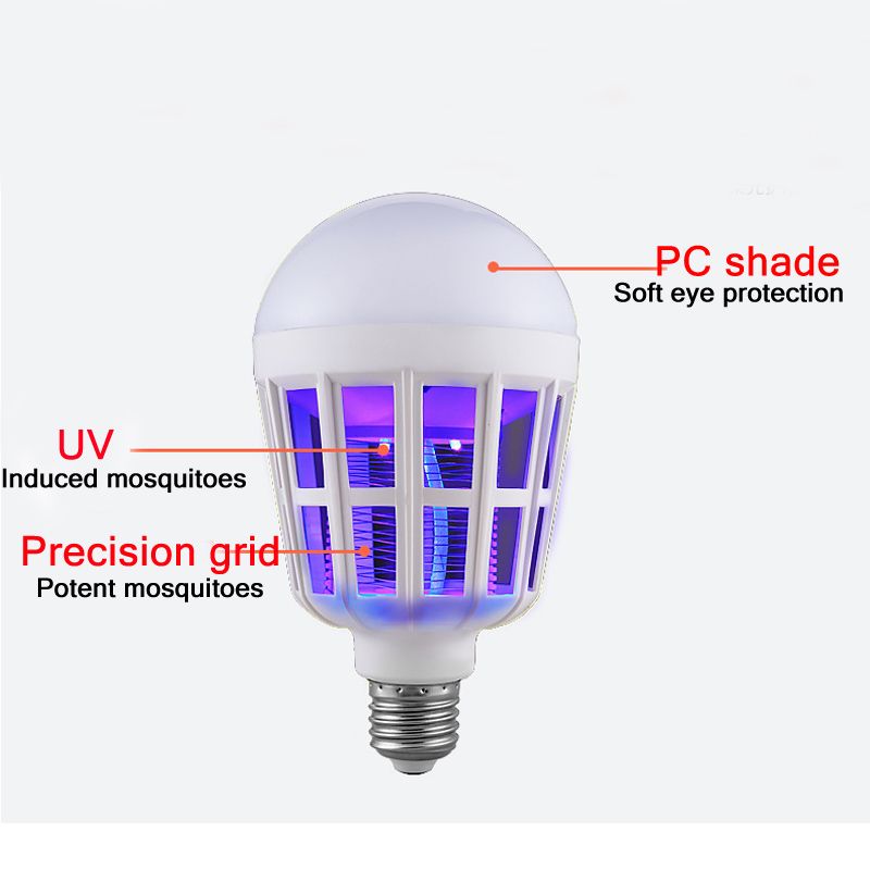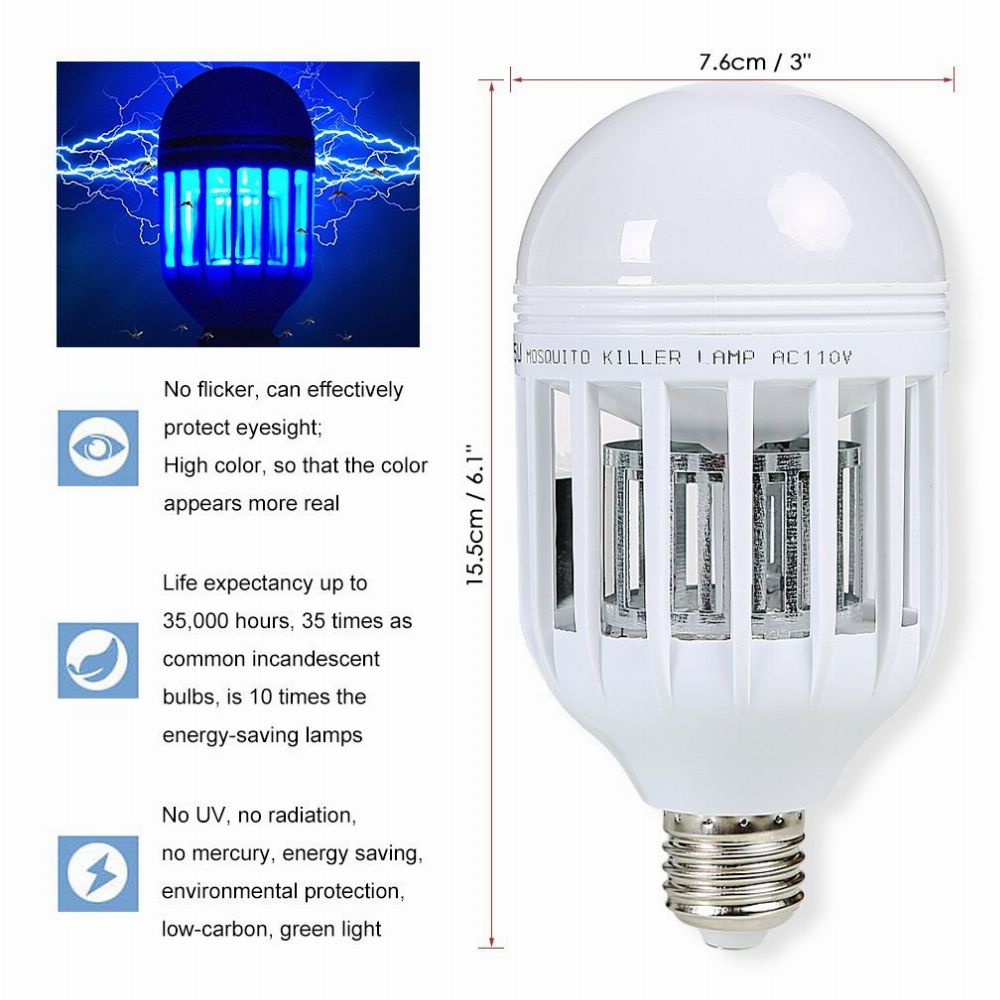 Specification: Power: 15W Input Voltage: 220V Color Temperature: 6500K Luminous Flux: 1000LM Angle: 360 degree Base Type: E27 LED Quantity: 6 Color: White Material: Plastic + PC Size: Approx. 7.6*15.5cm (L*H) Rated frequency: 50Hz/60Hz Features: Both can lighting, also can kill mosquitoes Adjustable Modes: LED+ Electronic Mosquito, Electronic Mosquito Photocatalytic electronic mosquito, attracts and kills gnats, mosquitoes, moths, and other flying insects It can be applied to home kitchen, supermarket, stadium, office, warehouse etc Create a healthy green sincerely for your warm home space Package Included: 1 x LED Anti Mosquito Light Bulb
