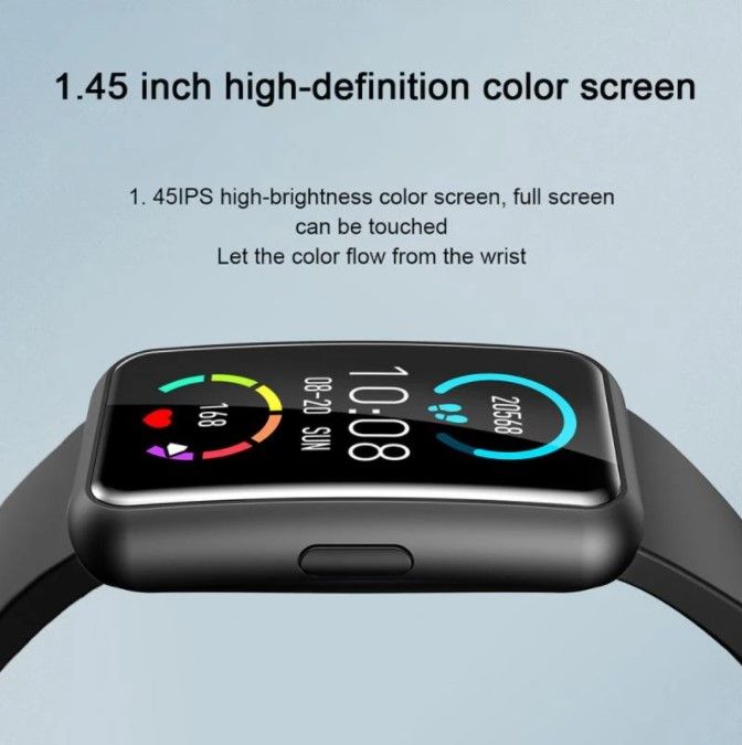 Features: Display screen: 1. 45 inch full fit full touch screen 172*320px Operation mode: full touch and side buttons CPU: 8762DK BT version: BT4.0 Waterproof rating: IP67 waterproof Heart rate sensor: HRS3300 Acceleration sensor: SC7A20 Battery capacity: polymer 145mAh Strap material: silicone Compatible platform: I0S9.0 or above and Android5.0 or above Specifications: 1.45 inch high-definition color screen 1. 45IPS high-brightness color screen, full screen can be touched Let the color flow from the wrist The new blood pressure monitoring method can measure blood pressure without connecting to a mobile phone. Tap on the bracelet to turn on the blood oxygen function, and the blood pressure data can be displayed directly on the bracelet, which can be synchronized to the mobile phone APP to regularly monitor blood pressure and understand changes in the body. This bracelet uses the acceleration sensor SC7A20 technology, which can accurately measure the heart rate, and it can also measure the heart rate in the state of exercise, to get rid of the constraints of the heart rate. Multiple sports modes: Badminton, basketball, football, swimming, walking, running, riding, skipping rope. Check the exercise data on the bracelet screen or APP to inspire you to forge ahead. In addition to health monitoring, it is also a sports bracelet with excellent performance. Intelligently record the number of steps, distance and calories of daily exercise, and quantify daily exercise. After the APP is connected and paired, you can receive message calls, weather forecasts, sedentary reminders, raise the wrist to brighten the screen, built-in alarm clock, stopwatch, remote control camera, control music playback and other applications. Better grasp the rhythm of life, and be able to do well in complicated work. Real-time monitoring of sleep heart rate and sleep quality, judge and record the state of deep sleep, light sleep, rapid eye movement, and time to help you fall asleep soundly every night. Magnetic charging for 2 hours Long-lasting standby, no disconnection 145mAh large-capacity battery, performance upgrade, chip improves standby battery life IP67 life waterproof Reach IP67 waterproof performance, support hand washing, sweating, It can be worn in multiple scenes such as in the rain to meet the needs of daily life. Watch UI languages: English, German, Korean, Spanish, Japanese, French, Russian, Arabic, Ukrainian, Italian, Portuguese Package list: smart watch*1 charging cable*1 user manual*1