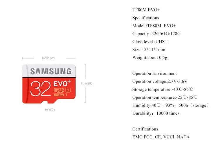 SAMSUNG Micro SD Memory Card EVO+ 32GB/SDHC 64GB/128GB/SDXC About capacity: 32GB=approximately 28GB-30GB 64GB=approximately 58GB-60GB 128GB=approximately 115GB-119GB Tips: How to verify the Capacity and Speed of the memory card? 1). Please use quaity USB 3.0 card reader to verify all memory card by H2testw on PC. Real memory card should pass H2testw with no error. 2). Please don't use cheap card reader to test Micro SD card, speed of Micro SD card will be reduced by low quality card reader. 3). Micro SD memory card speed is greatly affected by card reader and the capacity you choose , USB port ect. Low quality device will 100% slow down card speed,1MB=1000KB. Features: New EVO+ 32GB U1 Class10 speed == Max Rread speed to 95MB/s = SDHC New EVO+ 64GB U3 Class10 speed == Max Rread speed to 100MB/s = SDXC New EVO+ 128GB U3 Class10 speed == Max Rread speed to 100MB/s = SDXC please test on the USB3.0 reader and USB 3.0 port compute thanks